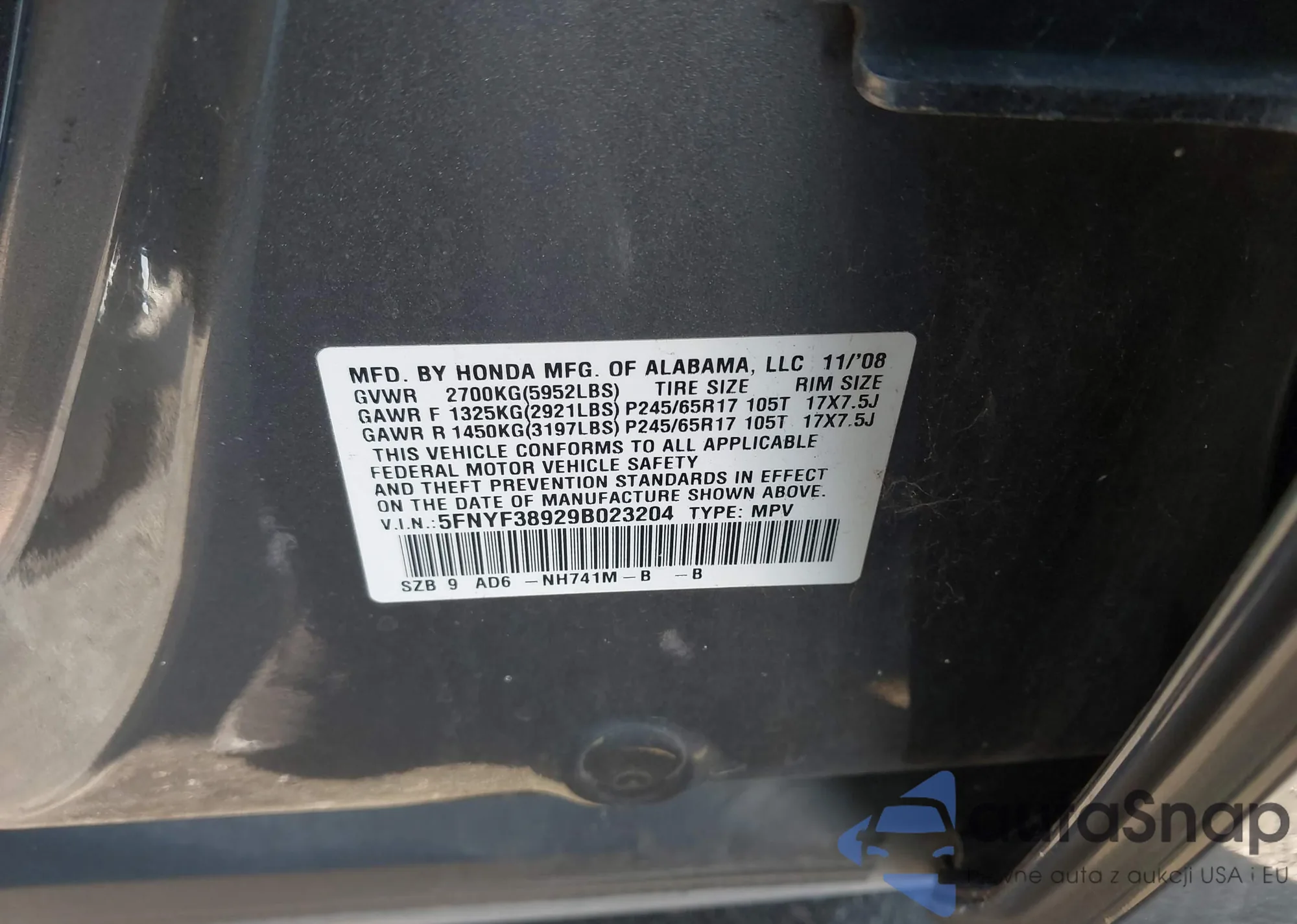 LOT: 43794870 VIN: 5FNYF38929B023204