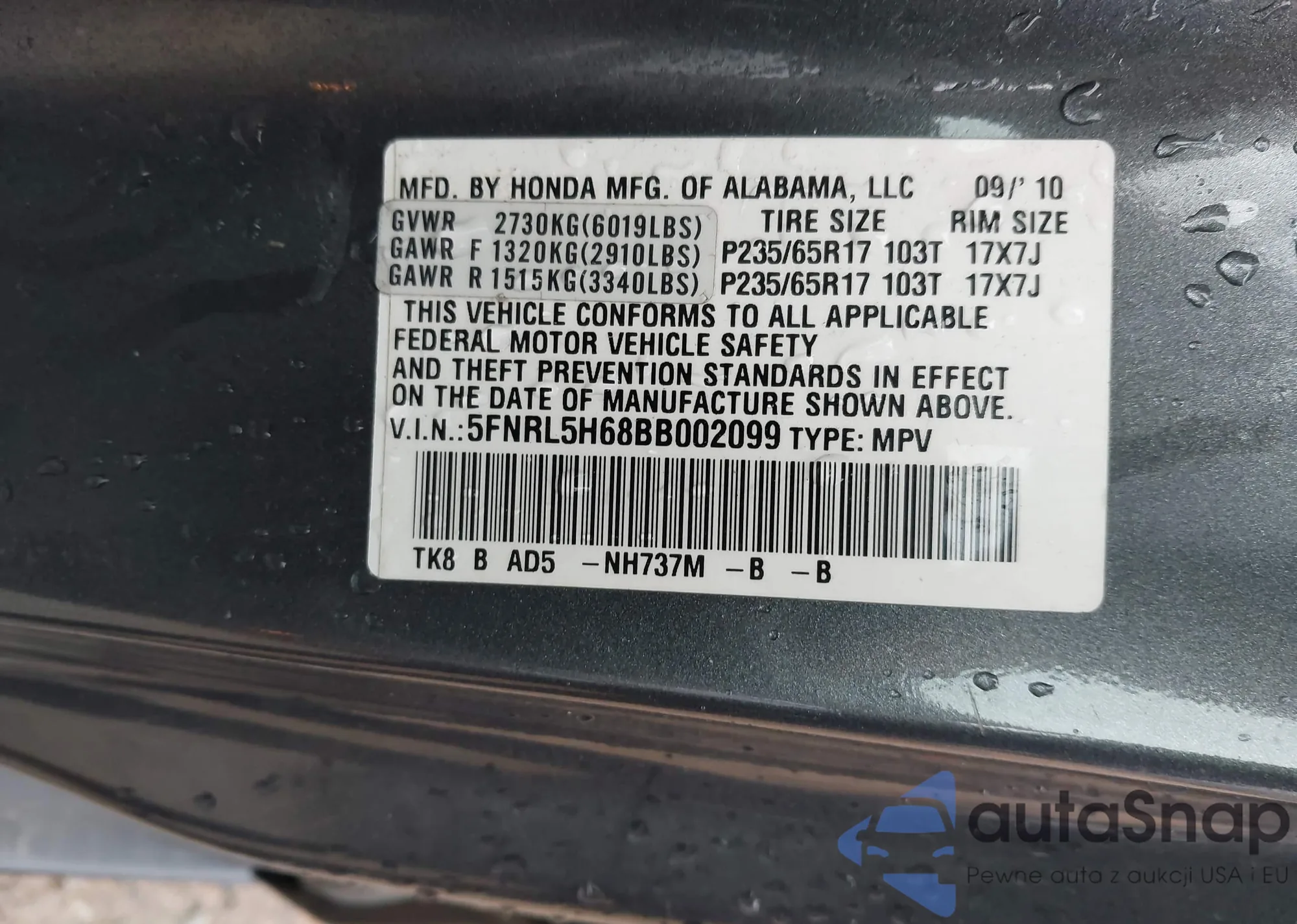 • VIN 5FNYF5H65KB019669