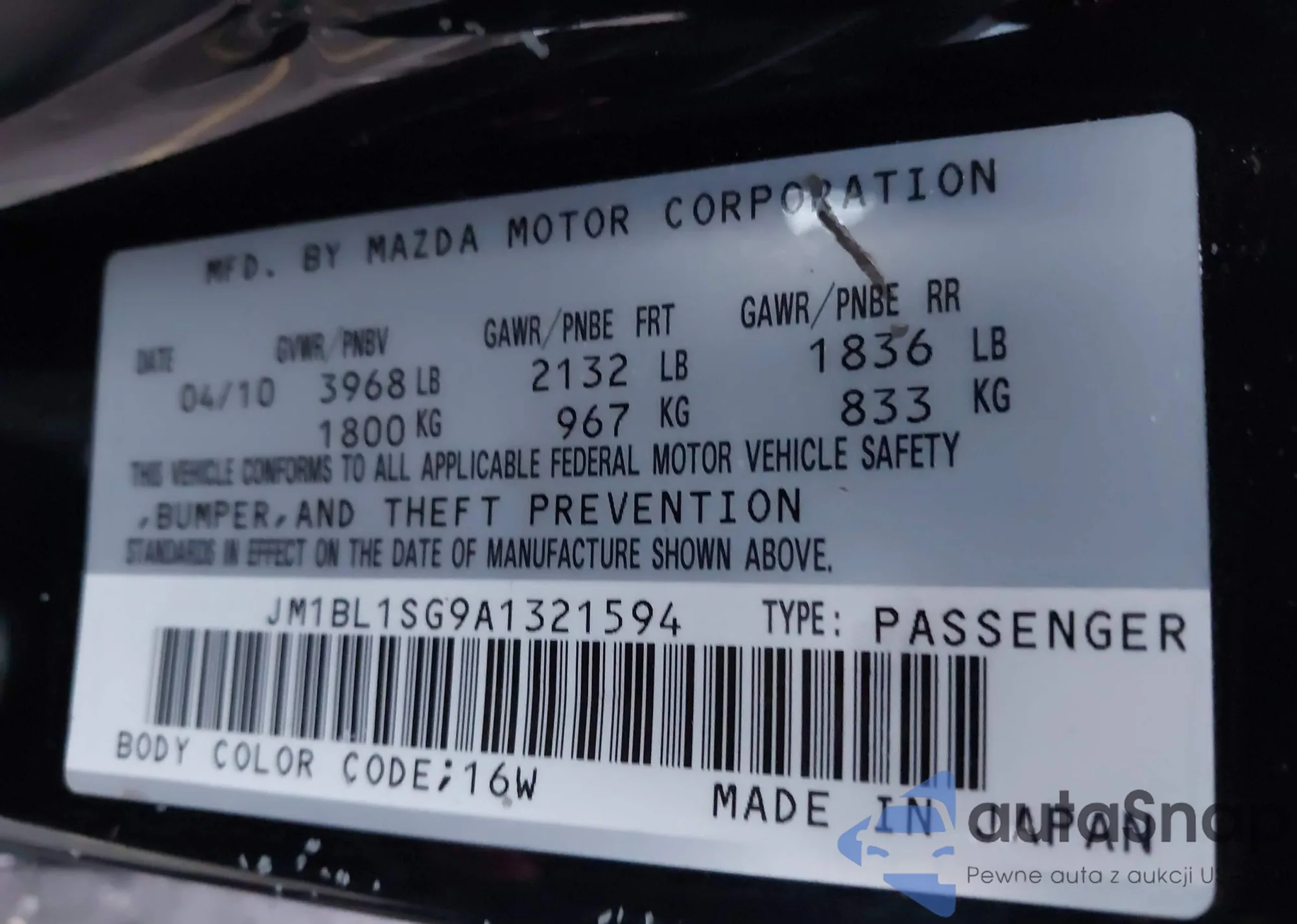 LOT: 43858268 VIN: JM1BL1SG9A1321594