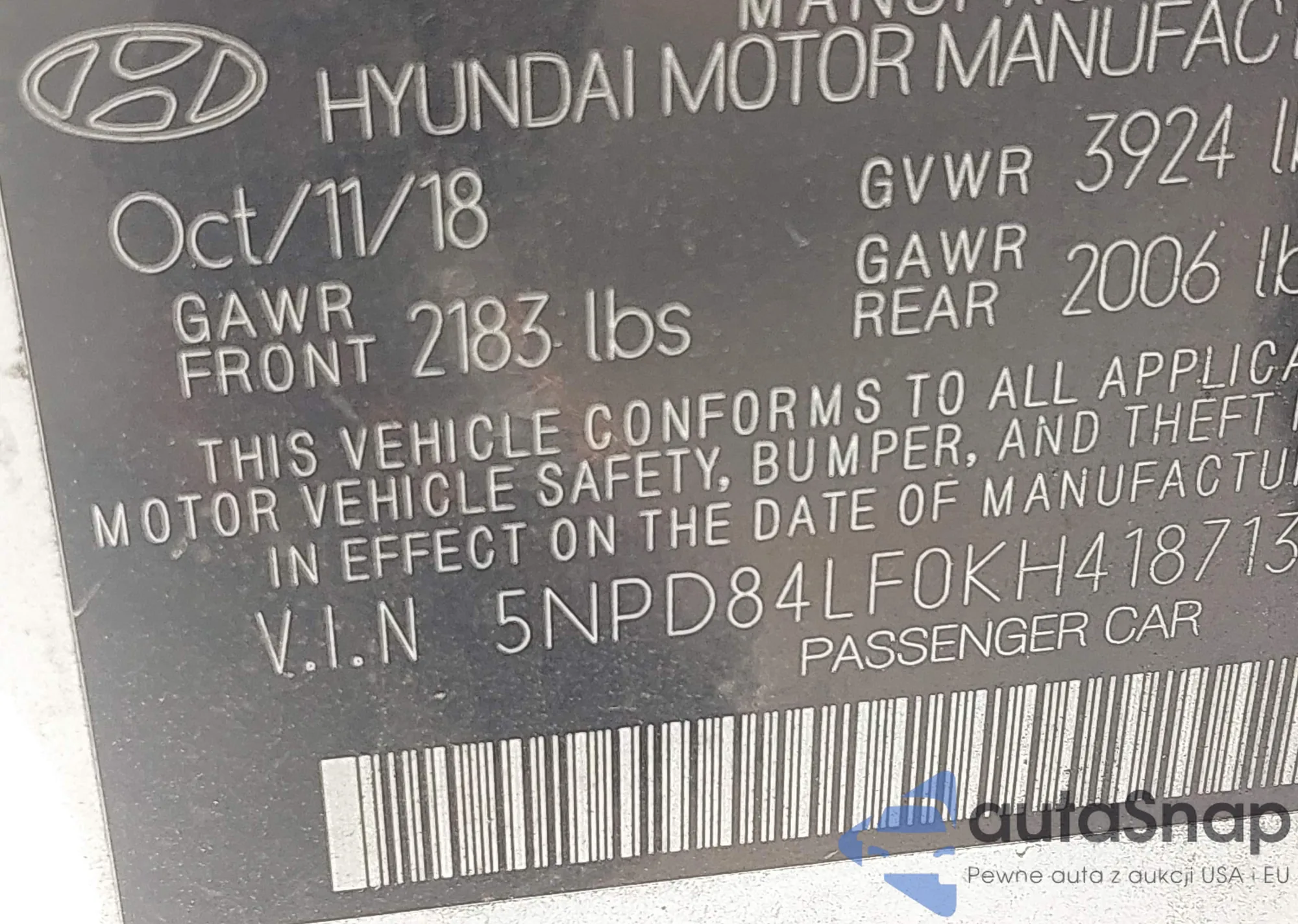 • VIN 5NPD84LF0KH418713