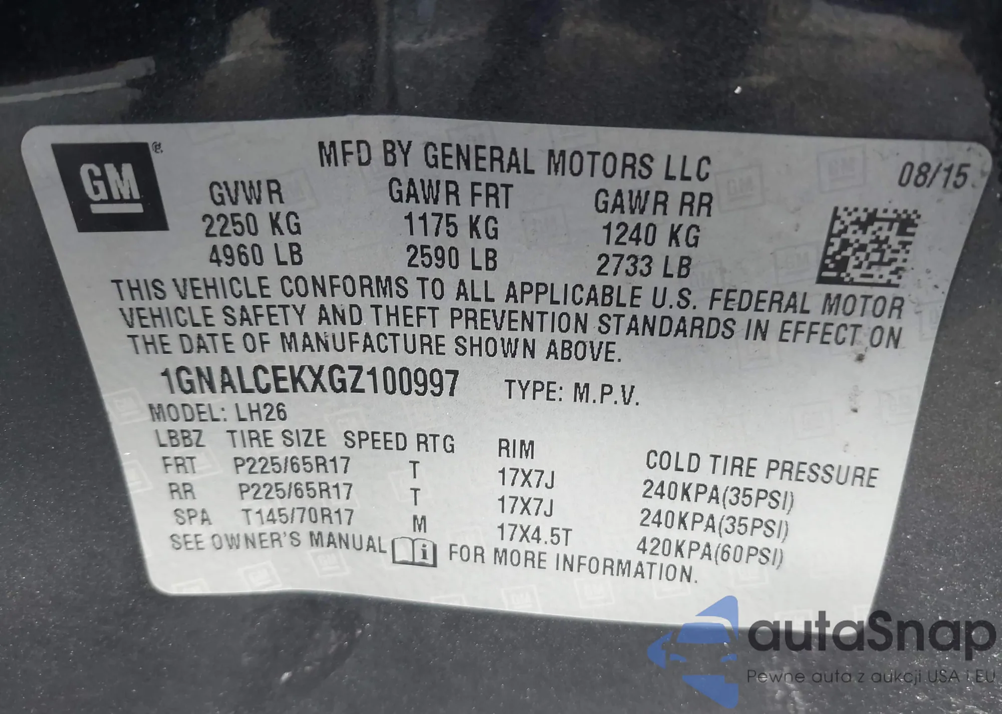 LOT: 43611216 VIN: 1GNALCEKXGZ100997