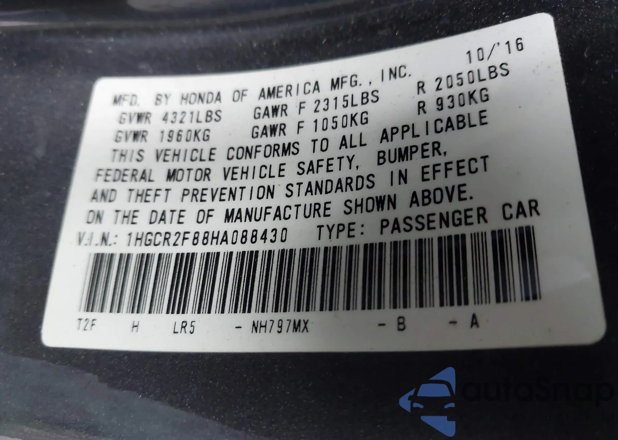 LOT: 43952917 VIN: 1HGCR2F88HA088430