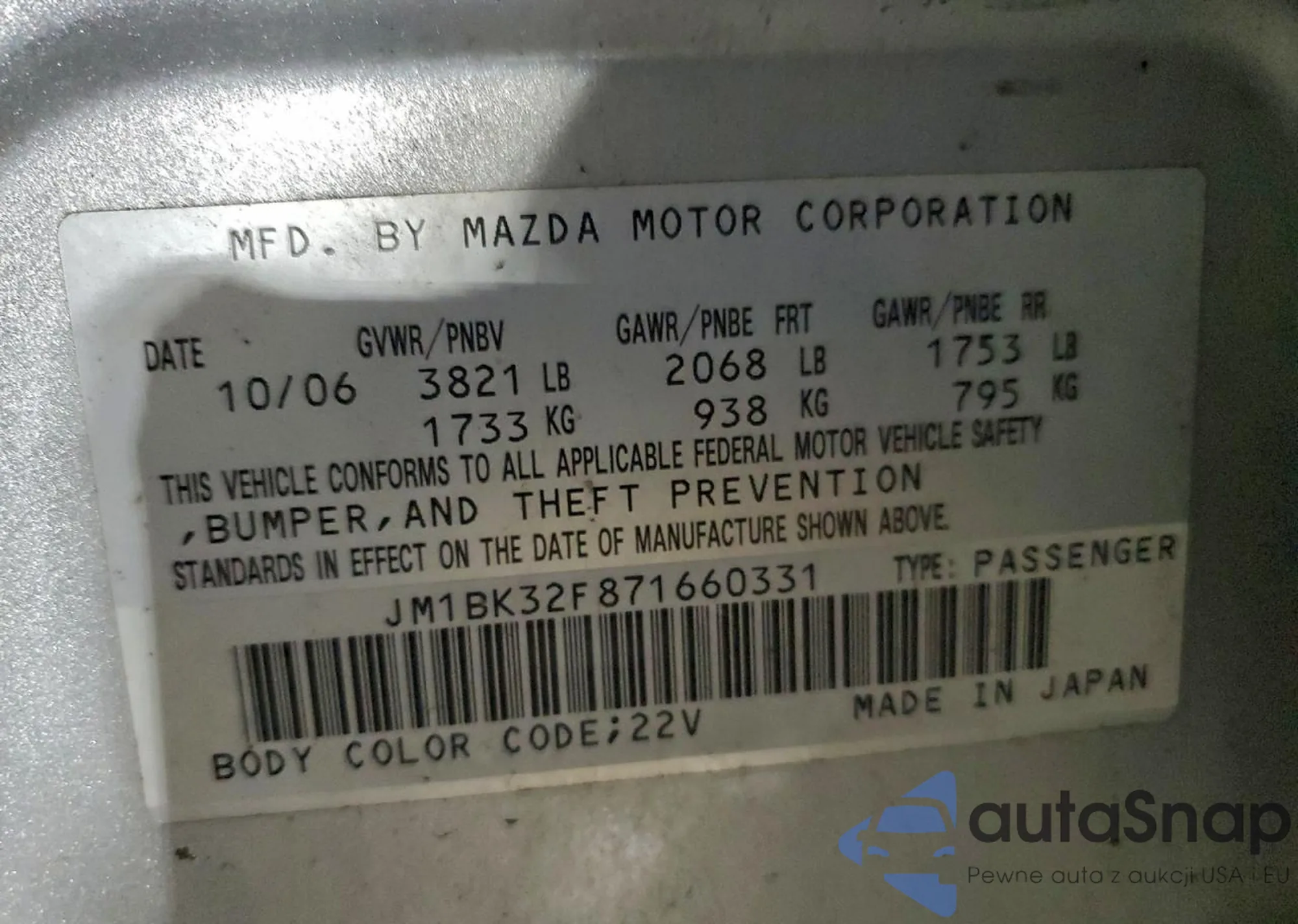 LOT: 96047625 VIN: JM1BK32F871660331