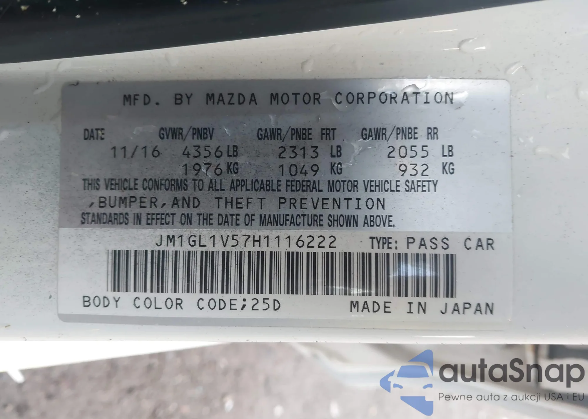 LOT: 43717358 VIN: JM1GL1V57H1116222