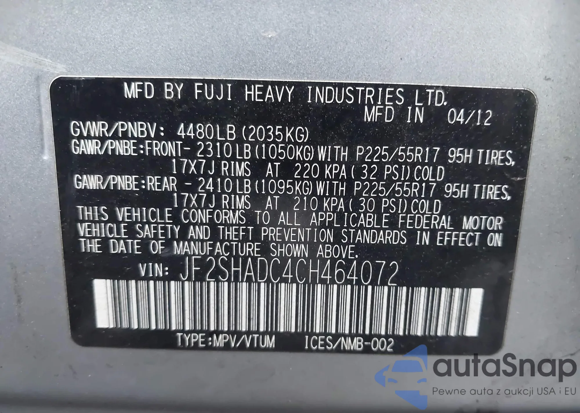 LOT: 43728170 VIN: JF2SHADC4CH464072