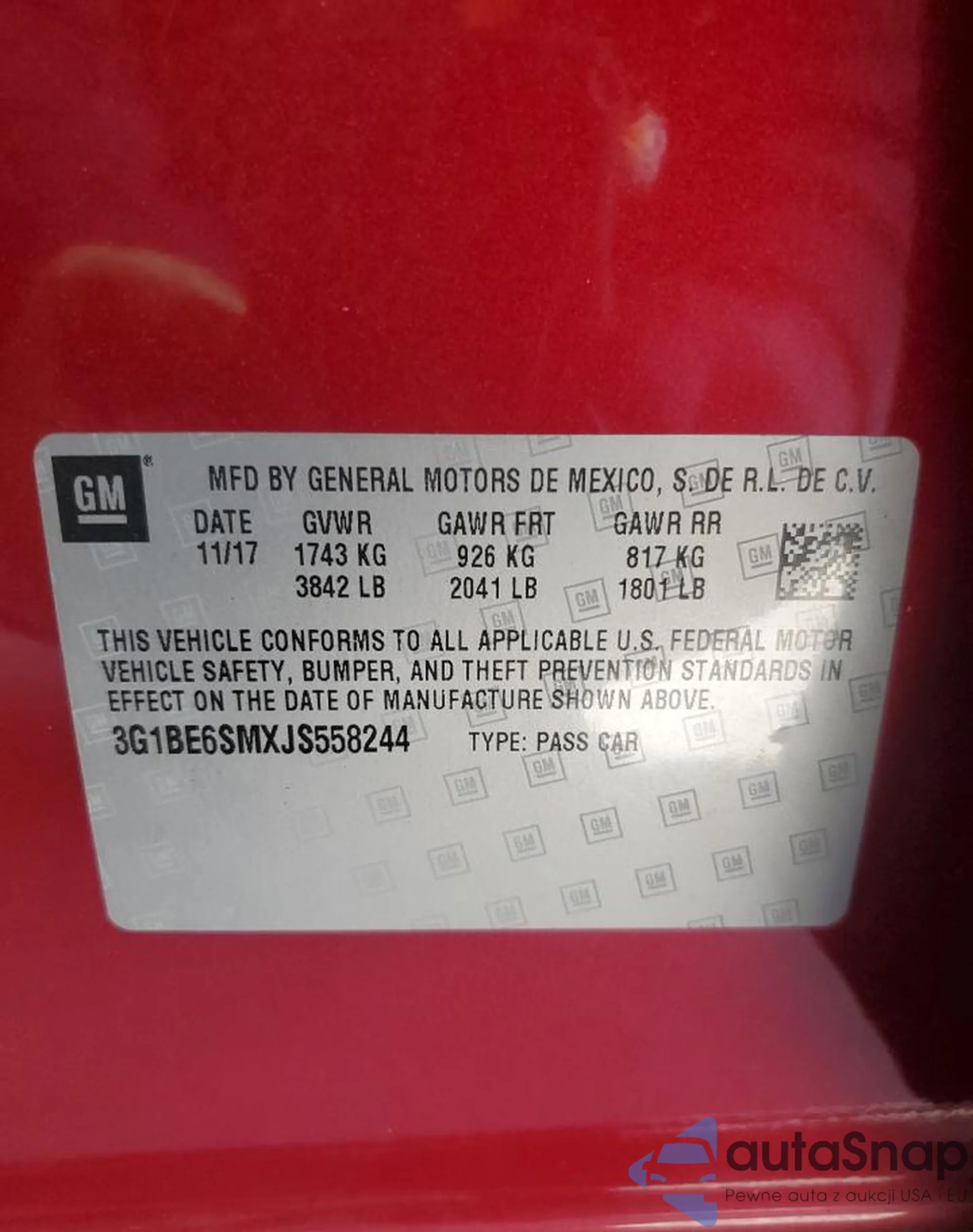 LOT: 85911095 VIN: 3G1BE6SMXJS558244
