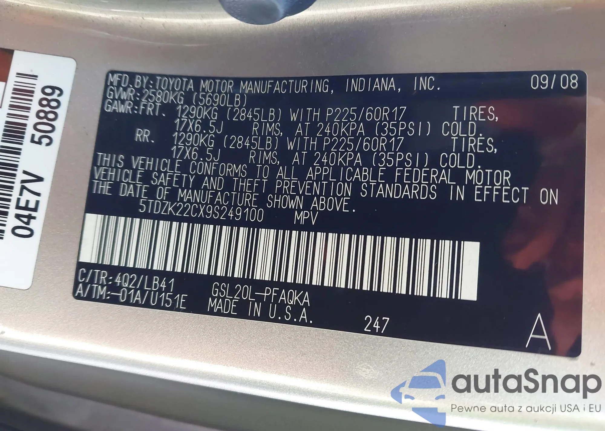 LOT: 43722409 VIN: 5TDZK22CX9S249100