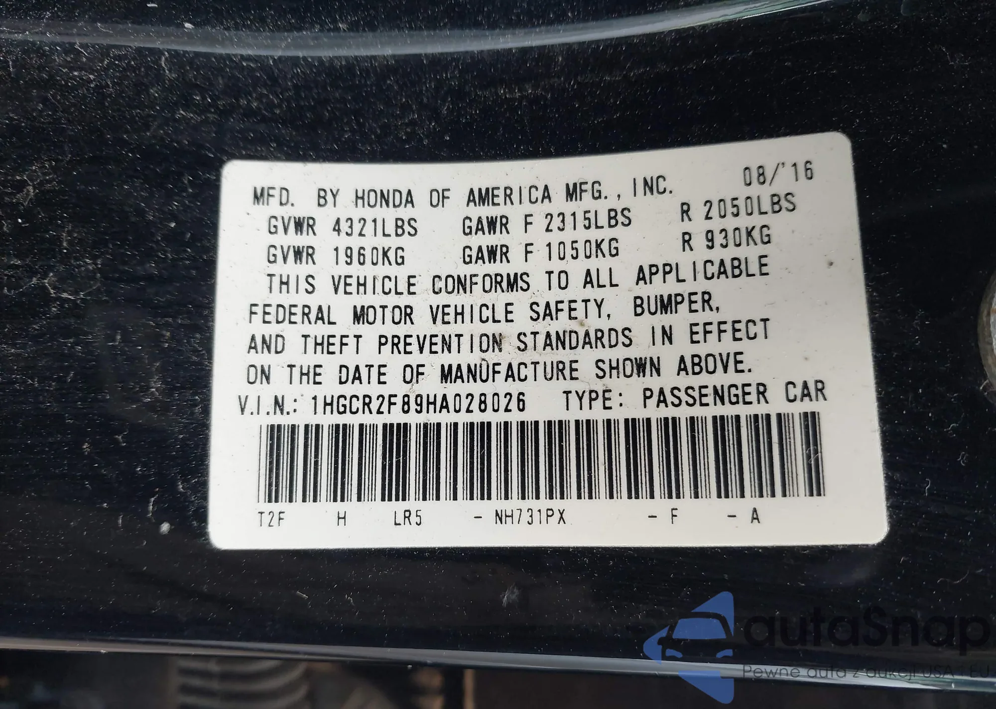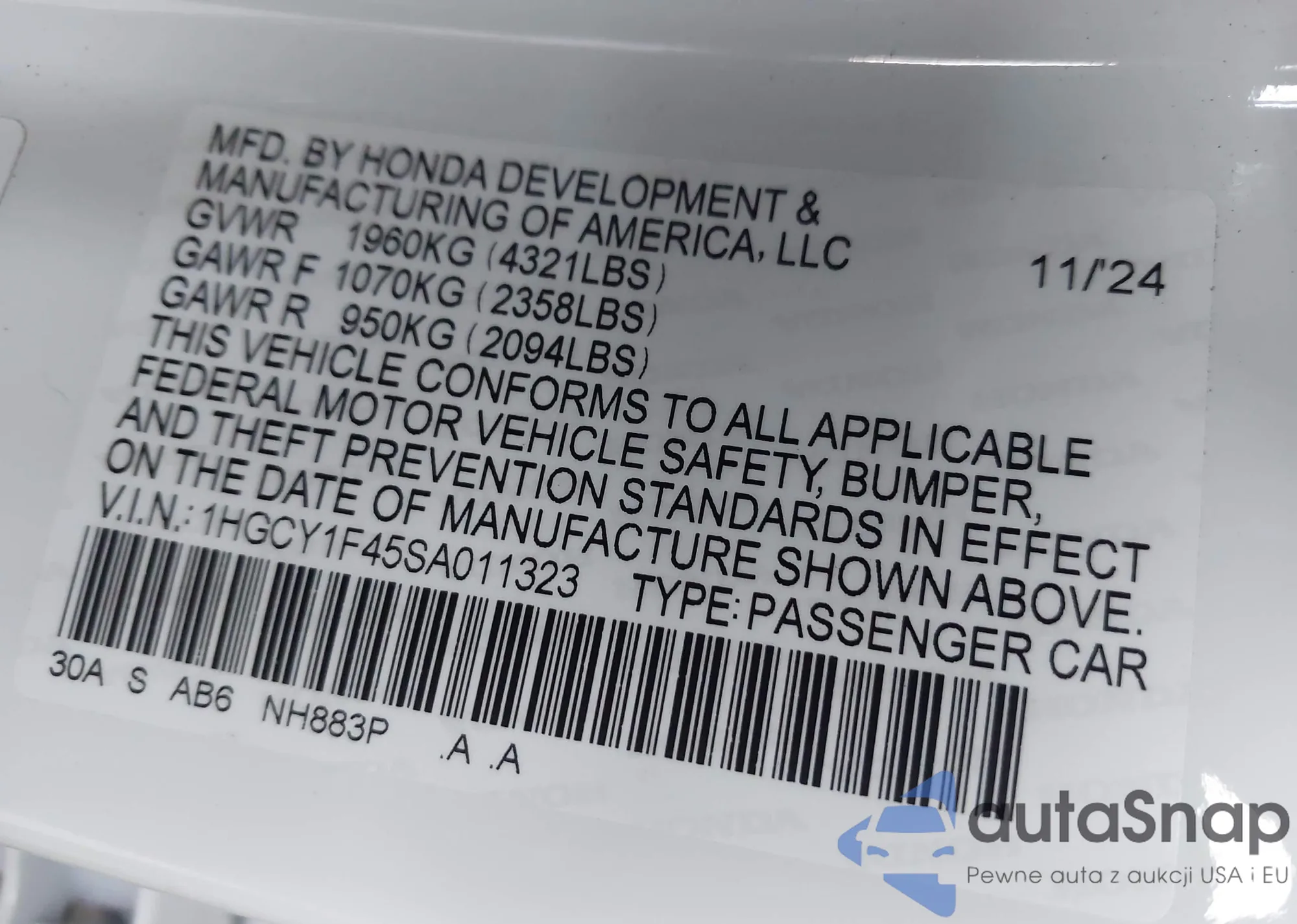 • VIN 1HGCY1F45SA011323