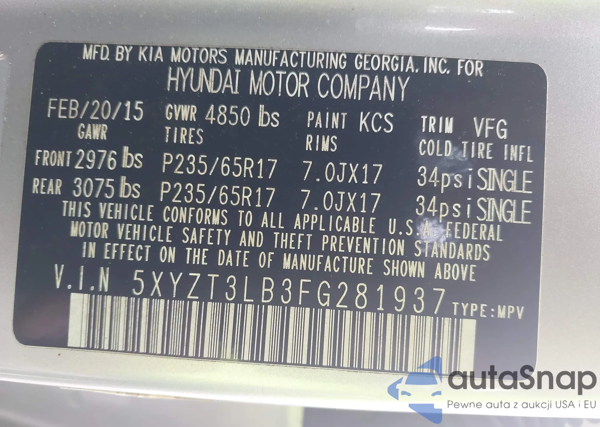 • VIN 5XYZT3LB3FG281937