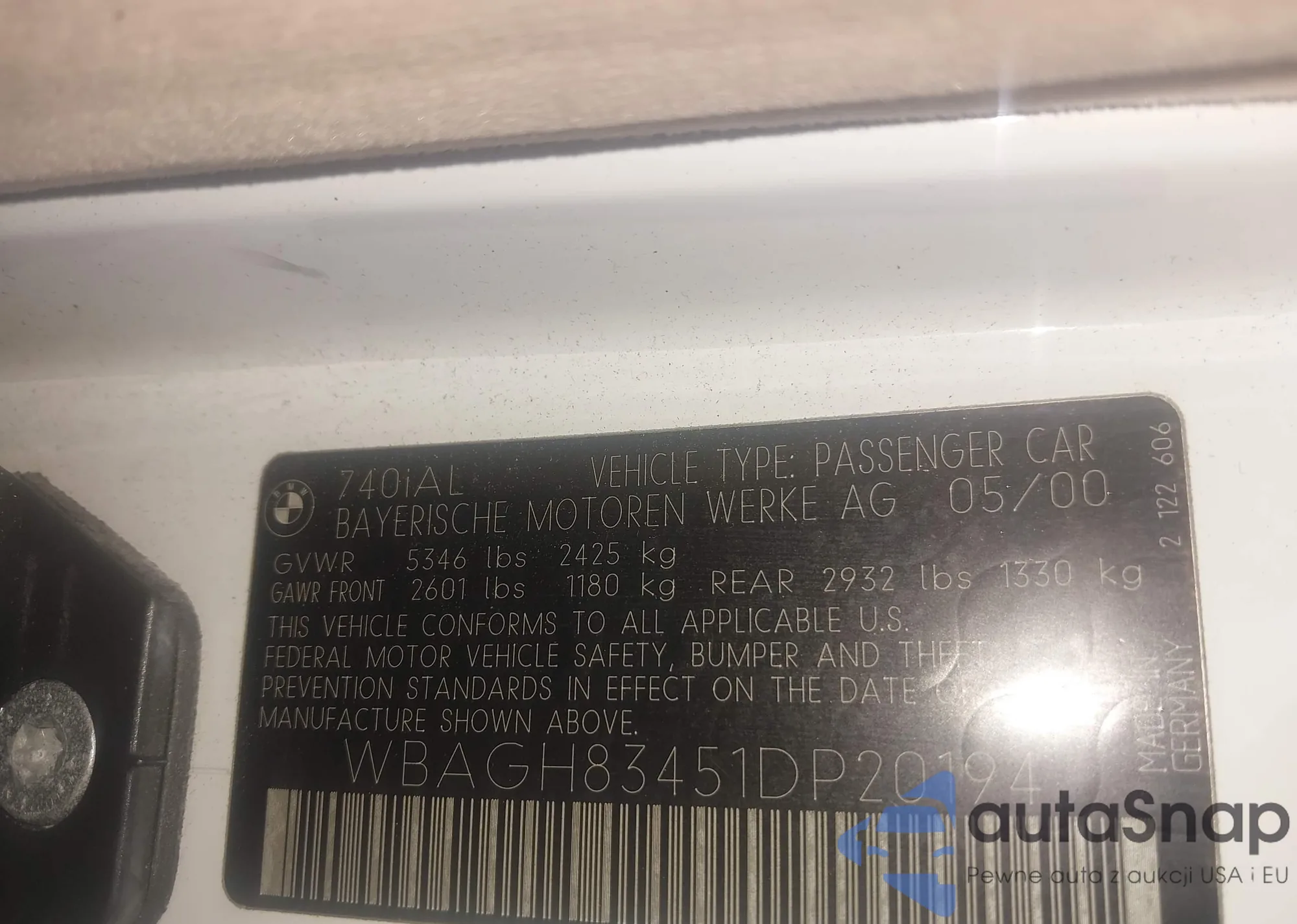 LOT: 43992334 VIN: WBAGH83451DP20194