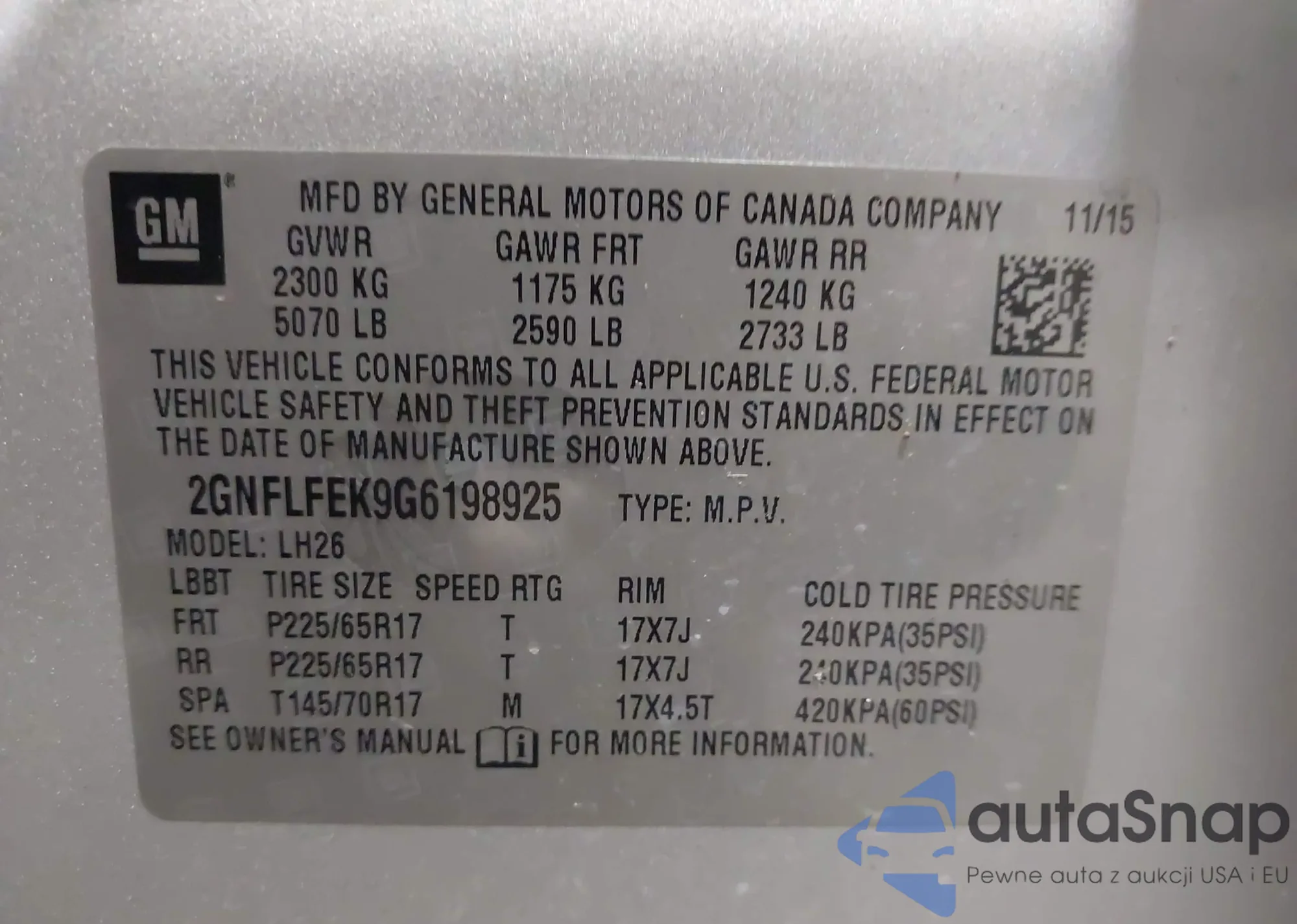 LOT: 44005393 VIN: 2GNFLFEK9G6198925