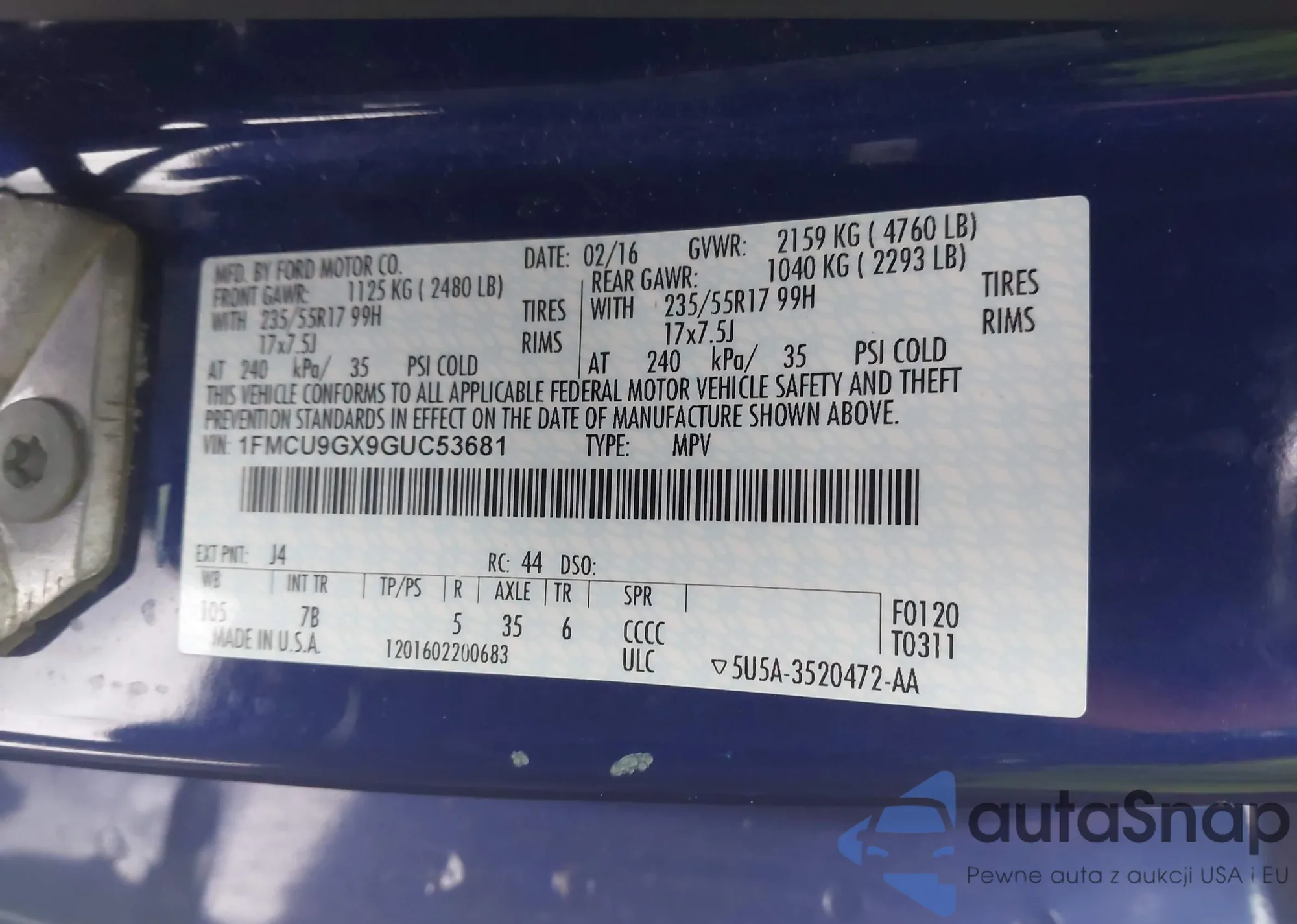 LOT: 43935395 VIN: 1FMCU9GX9GUC53681