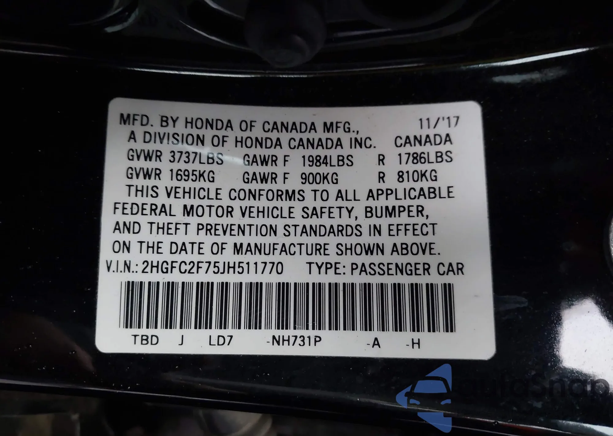• VIN 2HGFC2F75JH511770
