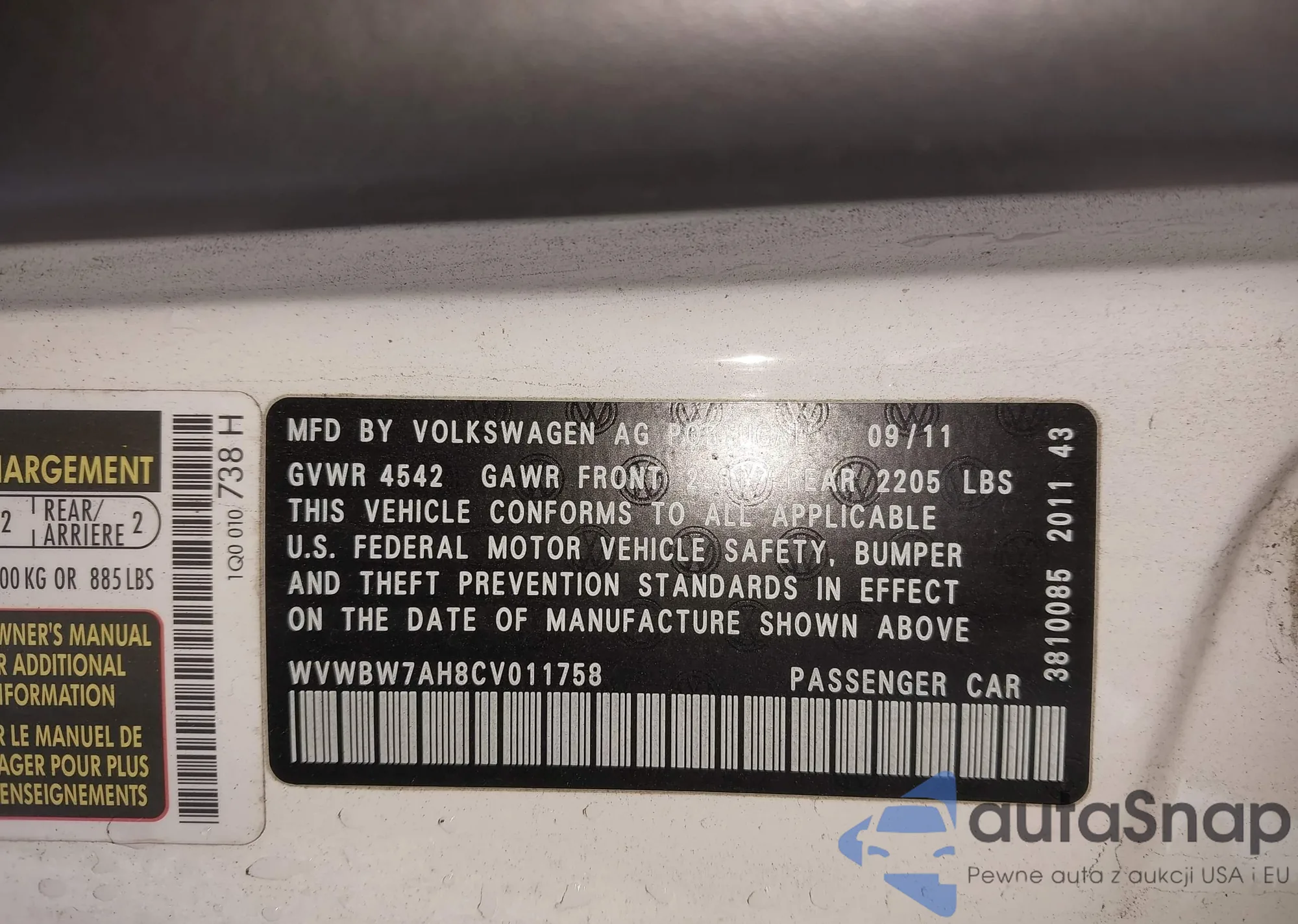 • VIN WVWBW7AH8CV011758
