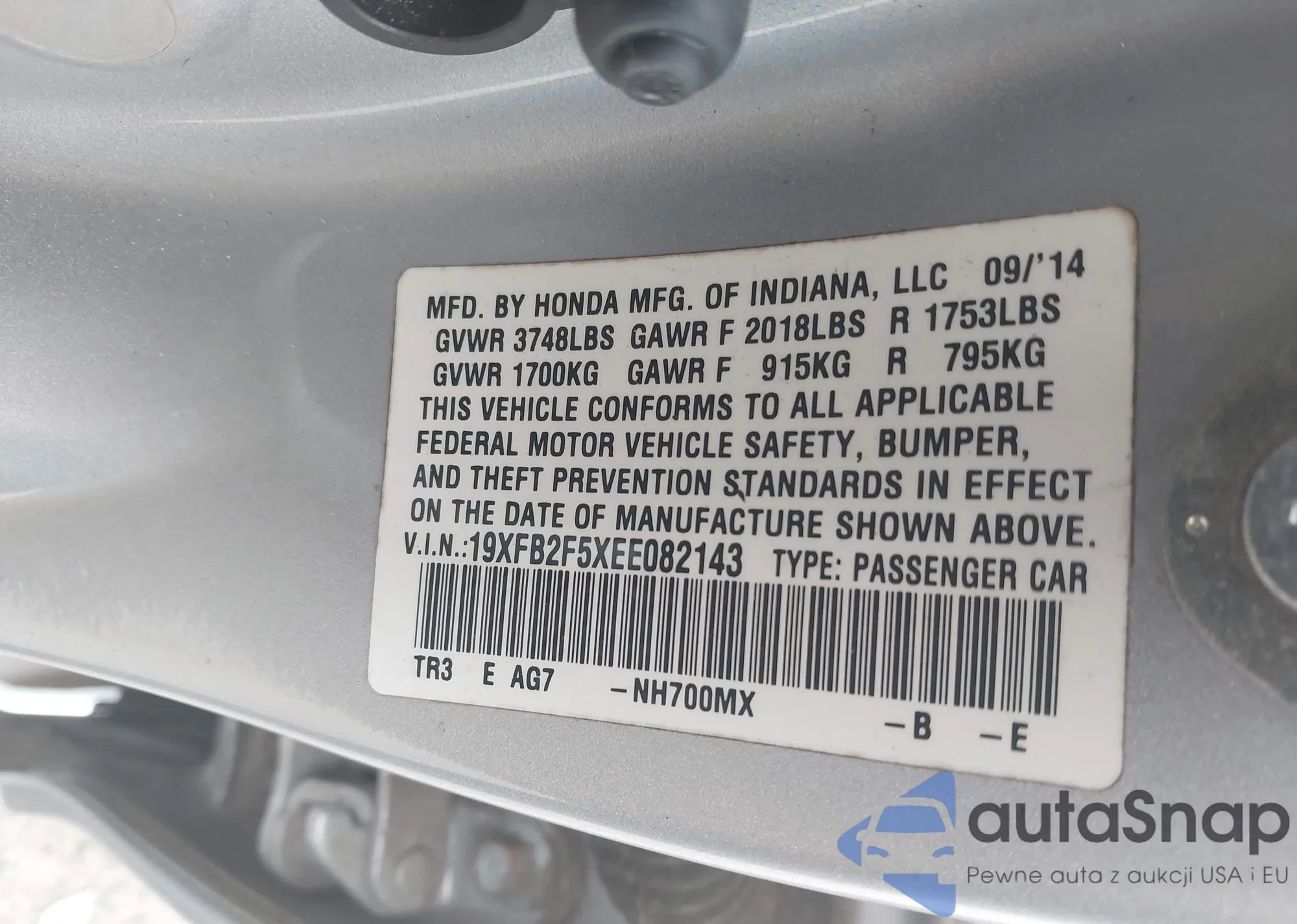LOT: 43971430 VIN: 19XFB2F5XEE082143