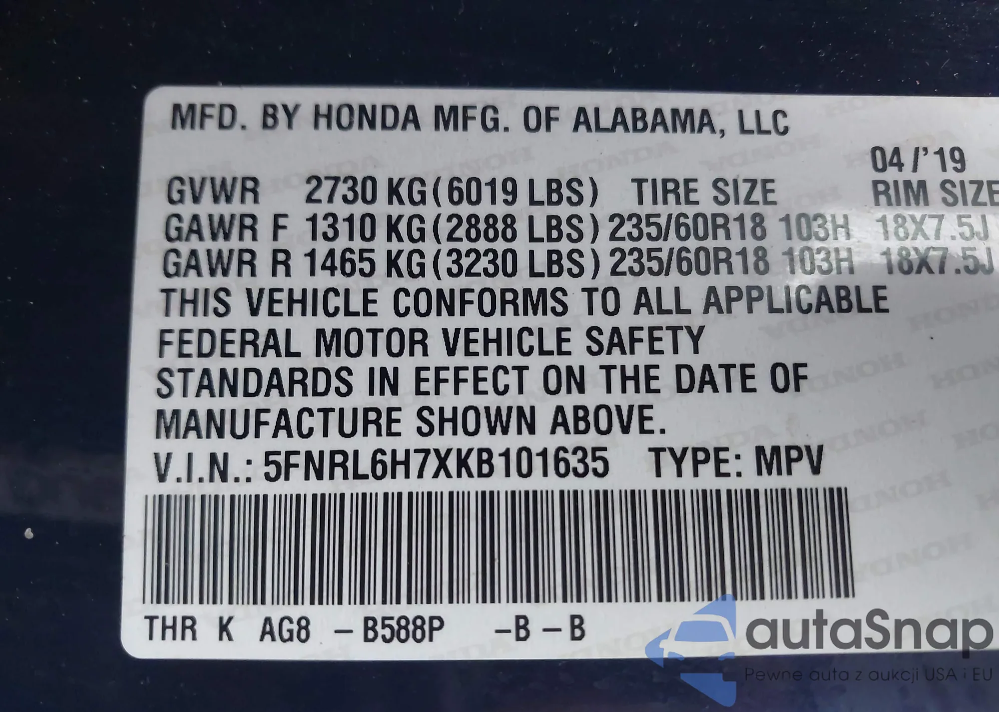 LOT: 43859874 VIN: 5FNRL6H7XKB101635