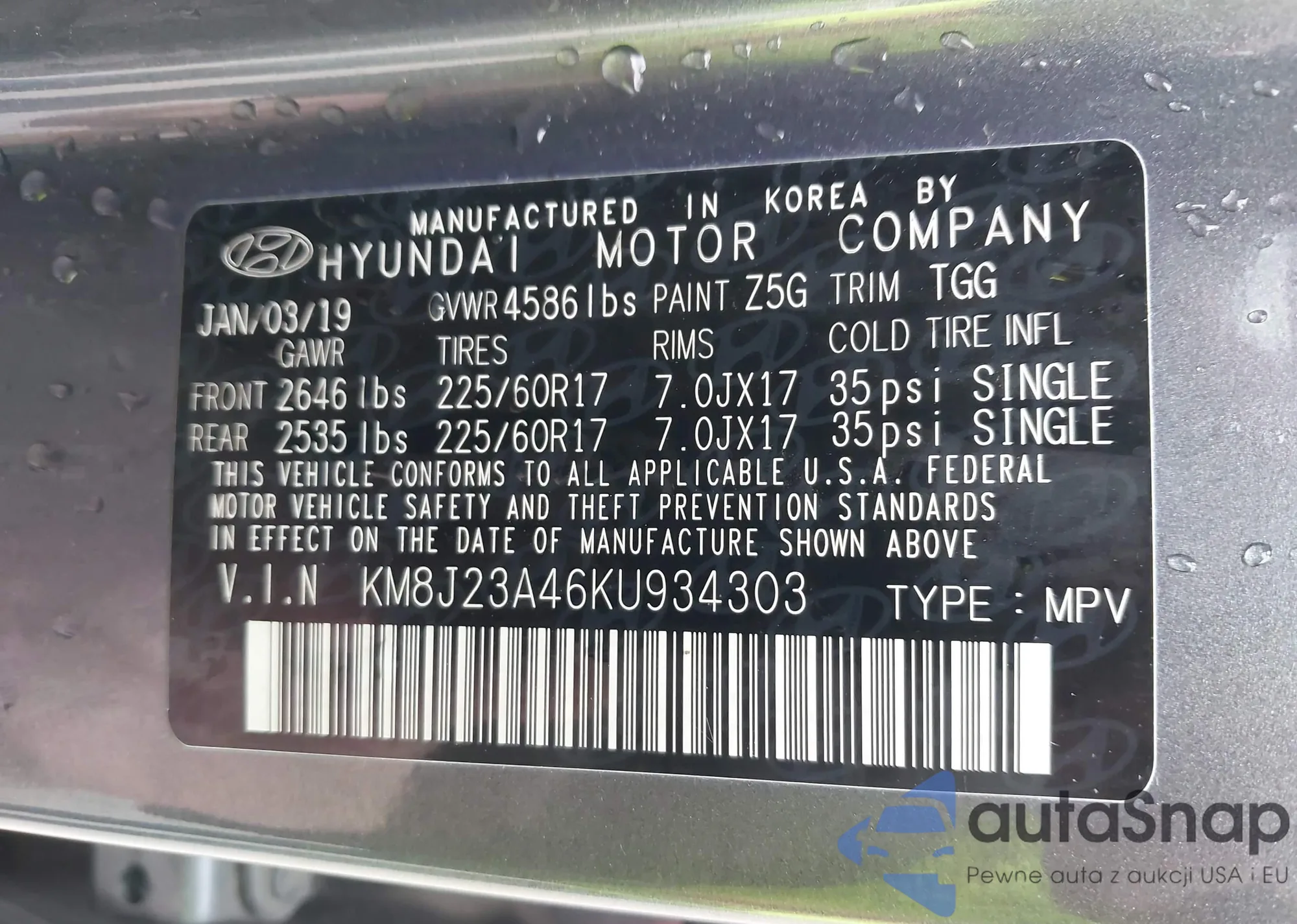 • VIN KM8J23A46KU934303