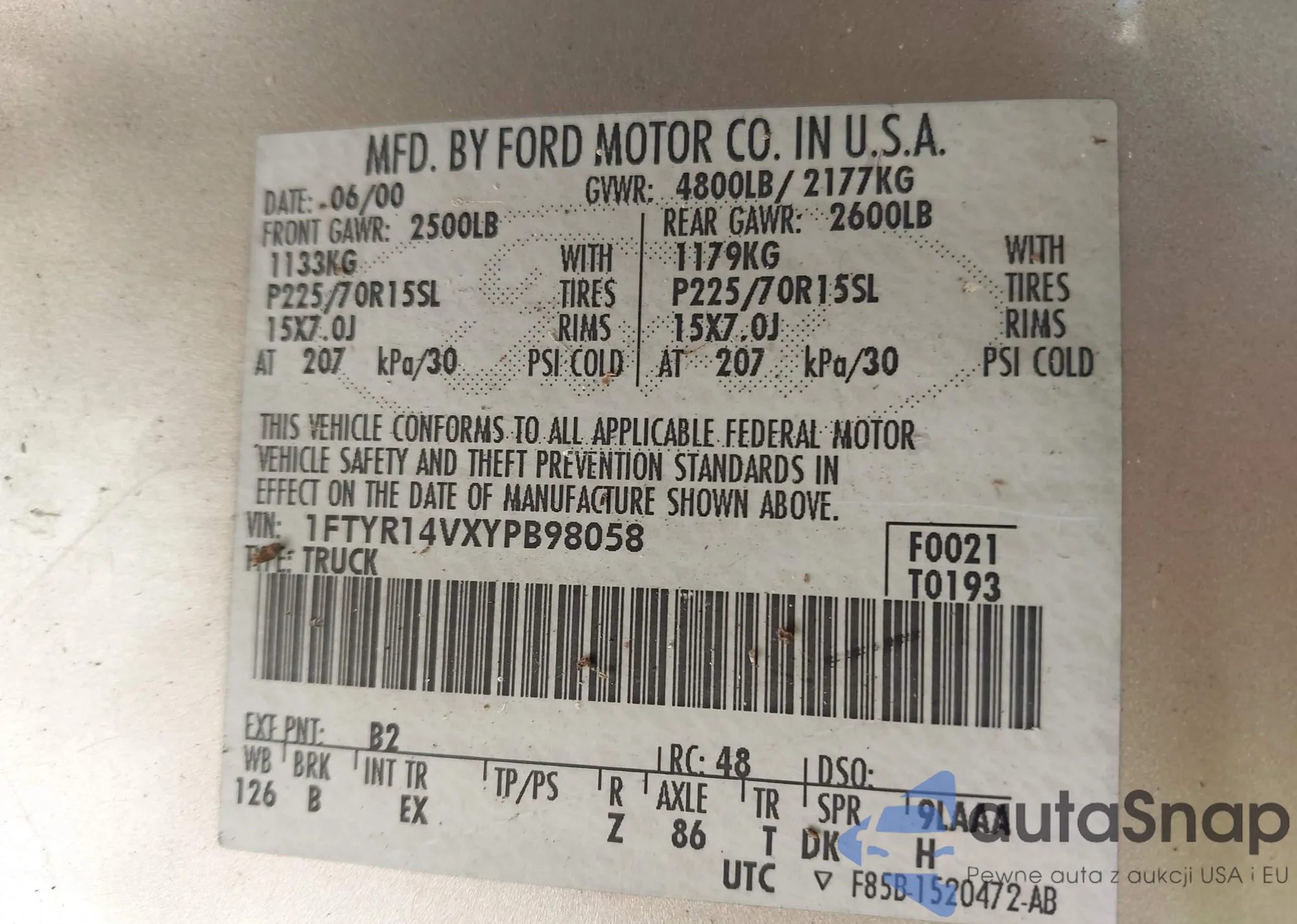 LOT: 43944221 VIN: 1FTYR14VXYPB98058