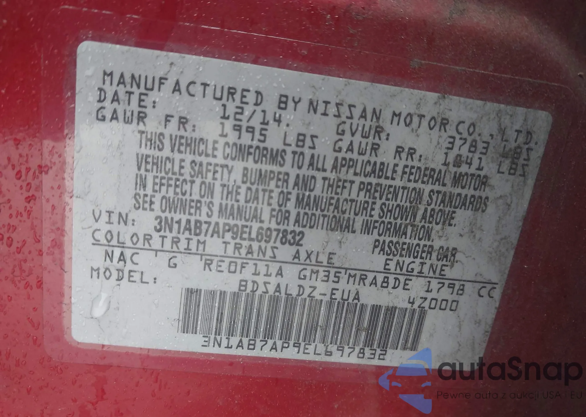 LOT: 43771503 VIN: 3N1AB7AP9EL697832