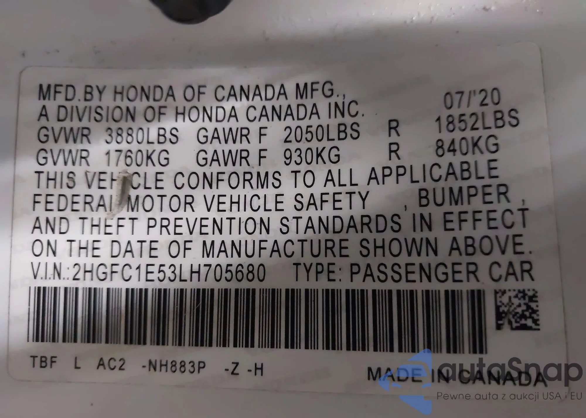 • VIN 2HGFC1E53LH705680