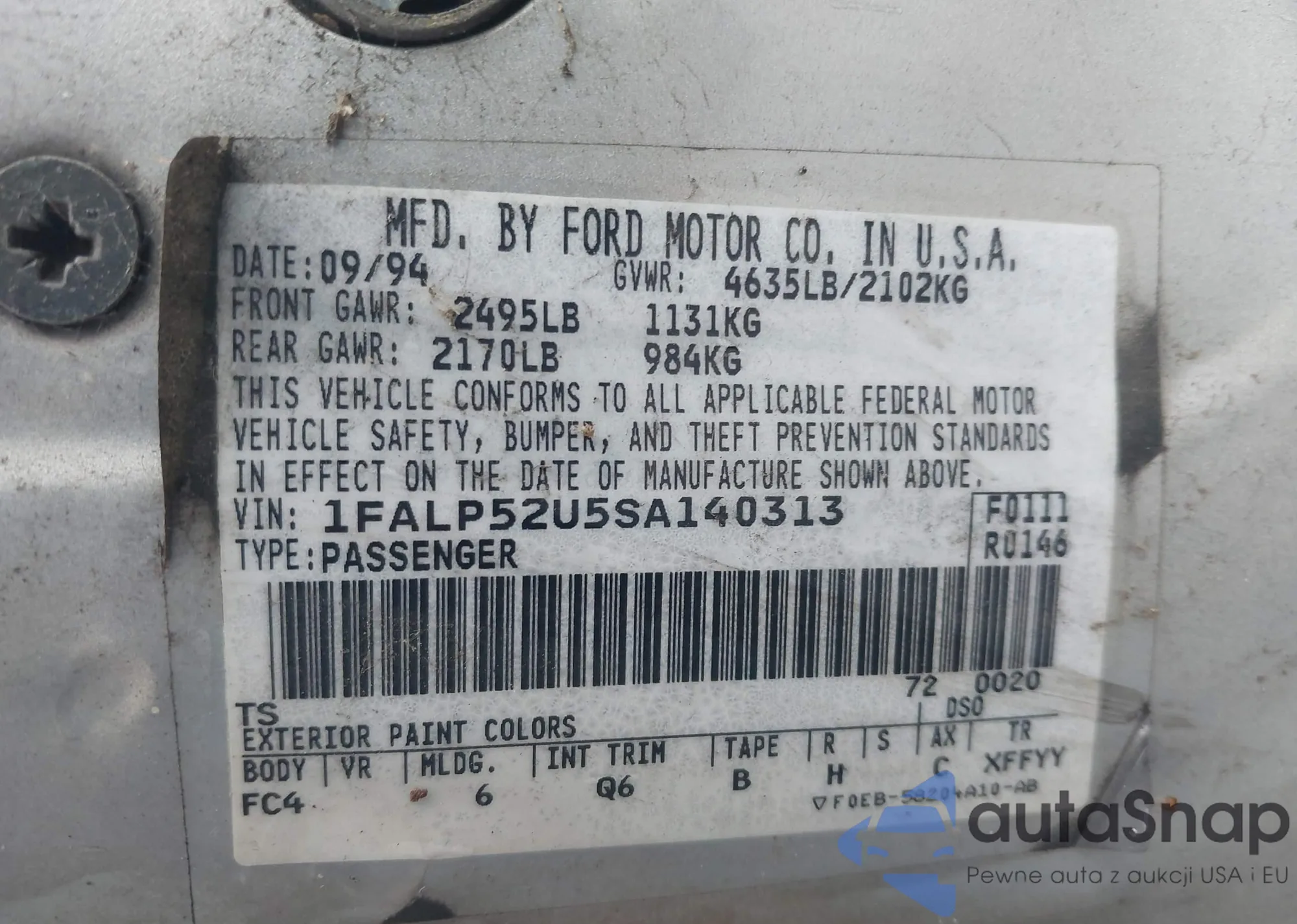 • VIN 1FALP52U5SA140313