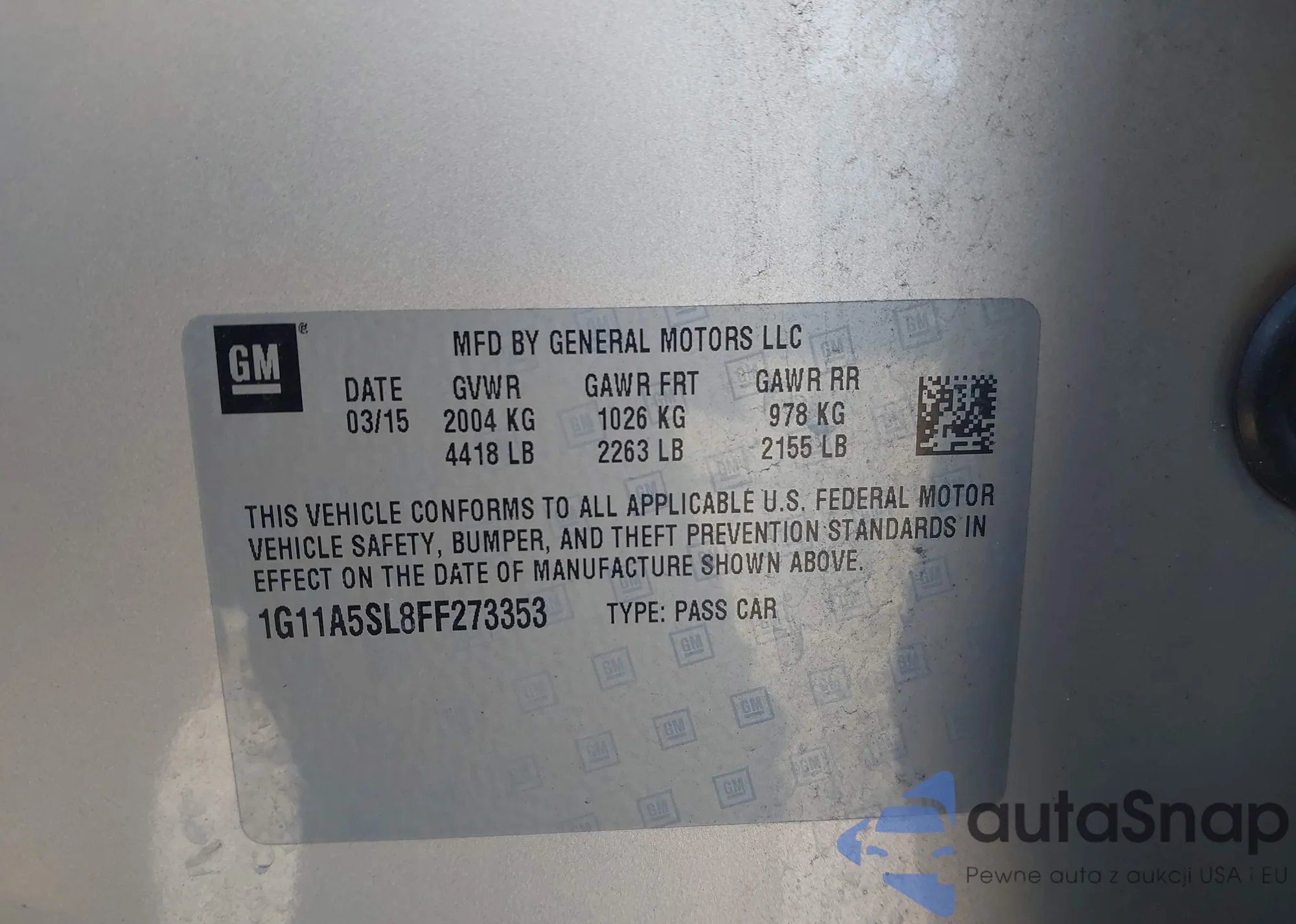 LOT: 43668293 VIN: 1G11A5SL8FF273353