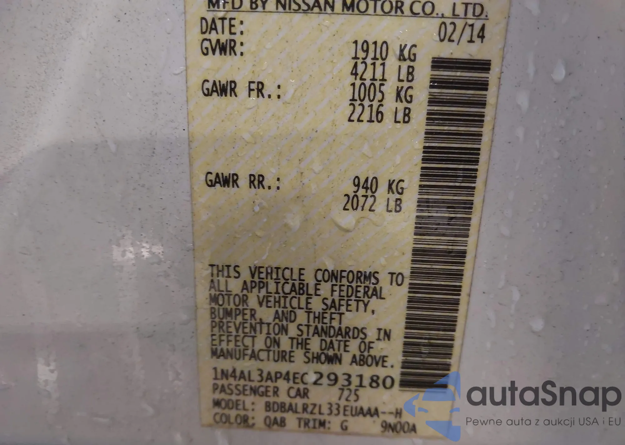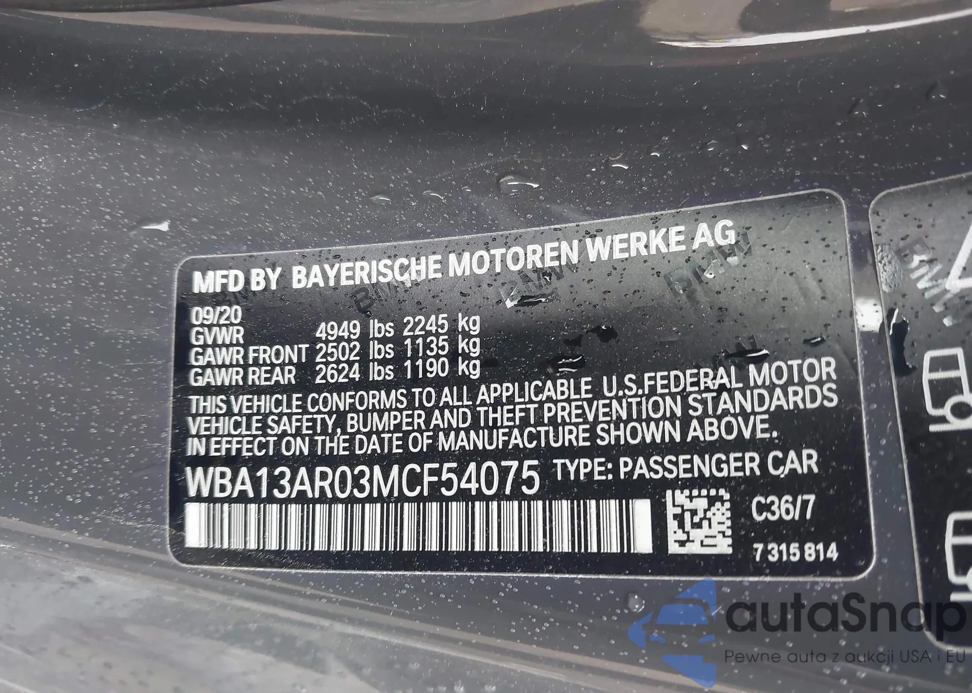 LOT: 43286837 VIN: WBA13AR03MCF54075