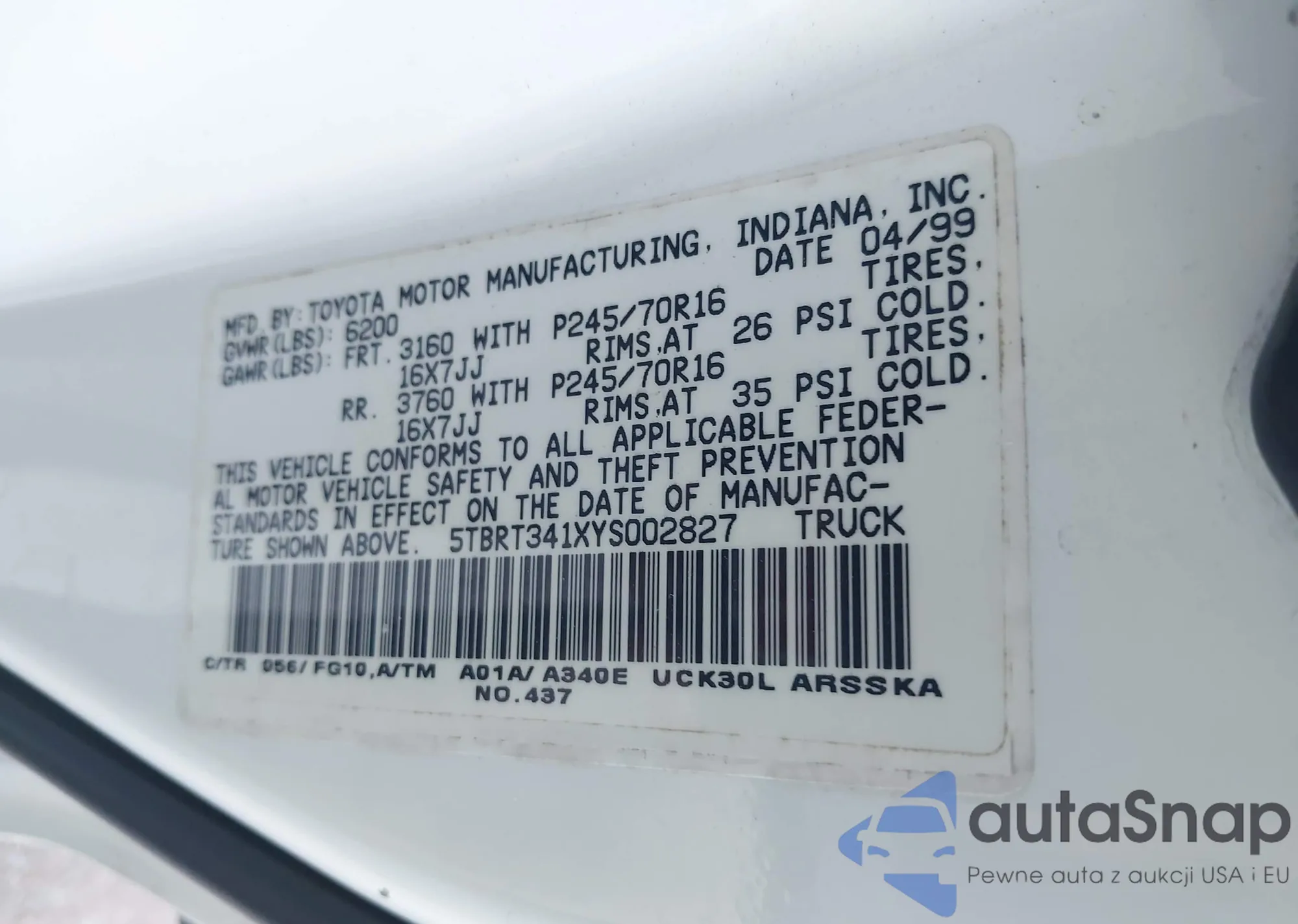 • VIN 5TBRT341XYS002827