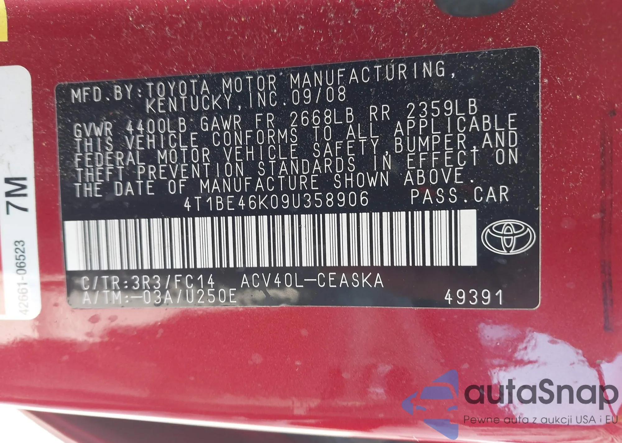 LOT: 43972872 VIN: 4T1BE46K09U358906