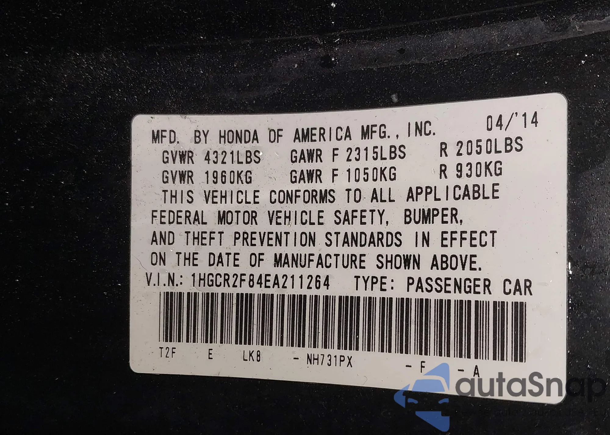 LOT: 43959221 VIN: 1HGCG16561A079981