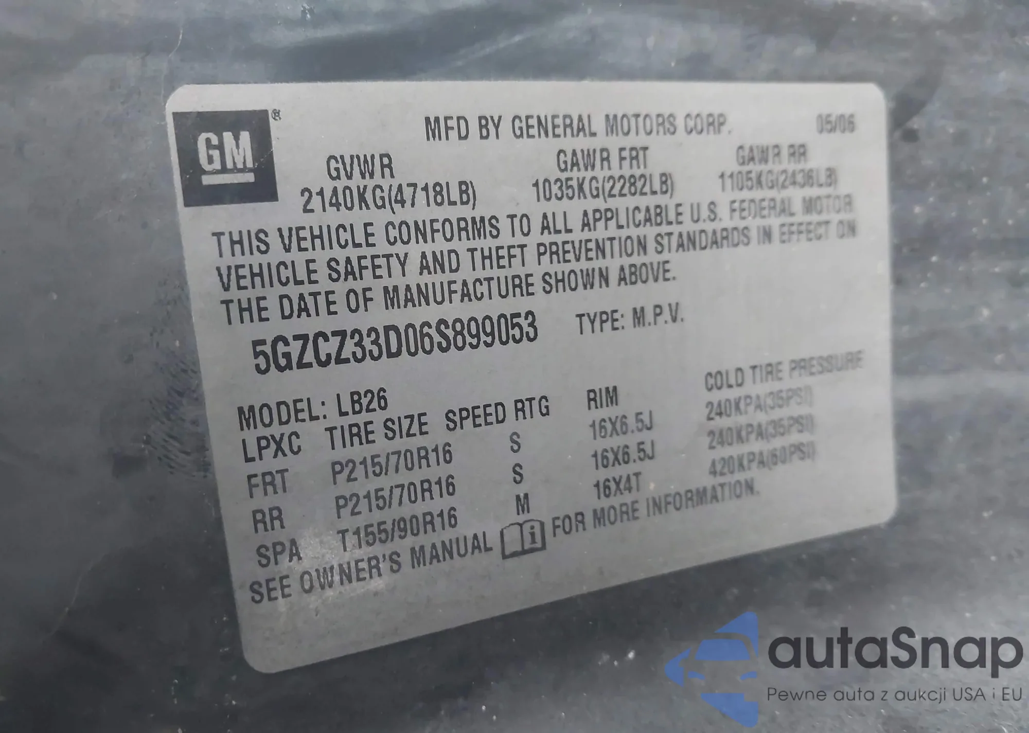 LOT: 43915917 VIN: 5GZCZ33D06S899053