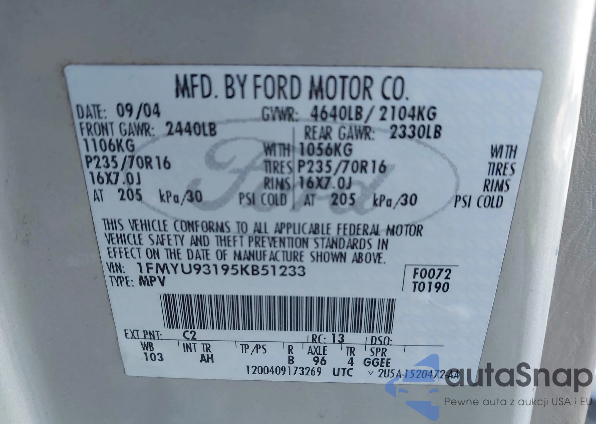 LOT: 43925453 VIN: 1FMYU93195KB51233