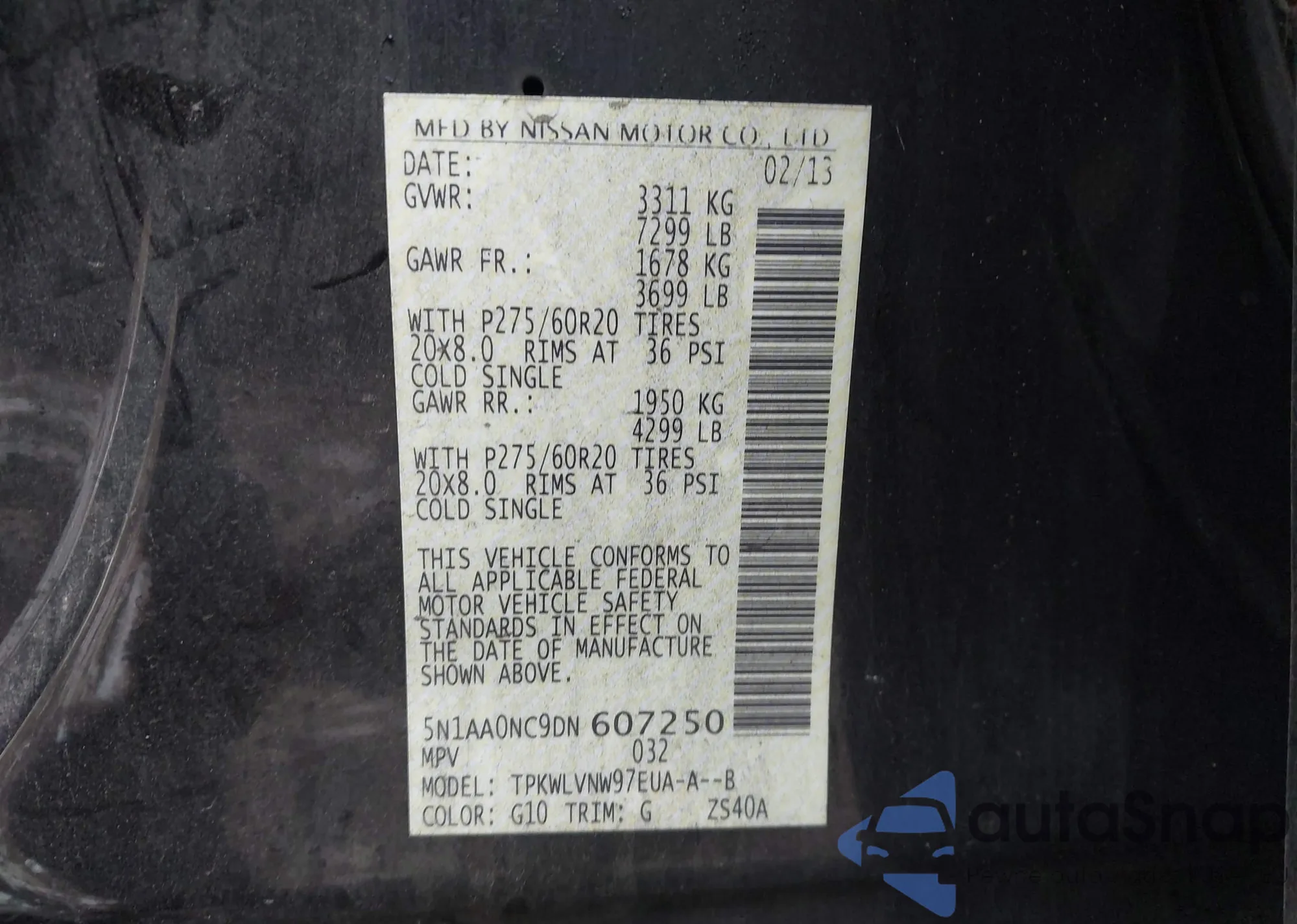 • VIN 5N1AA0NC9DN607250
