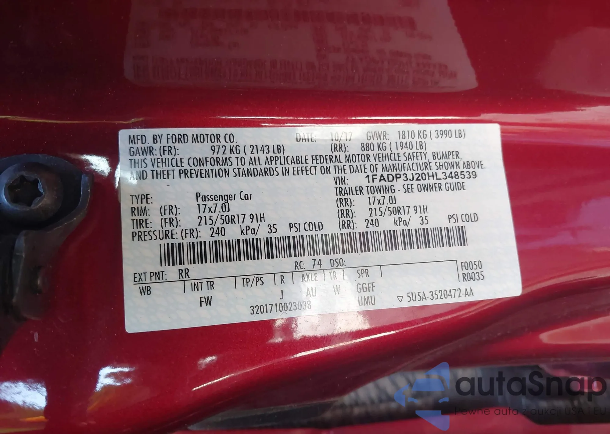 • VIN 1FADP3J2OHL348539