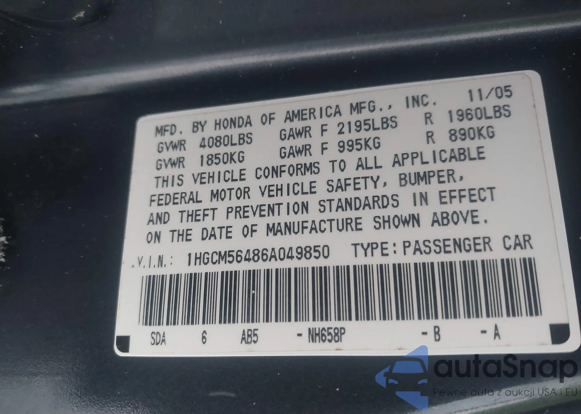 LOT: 43914012 VIN: 1HGCM56486A049850