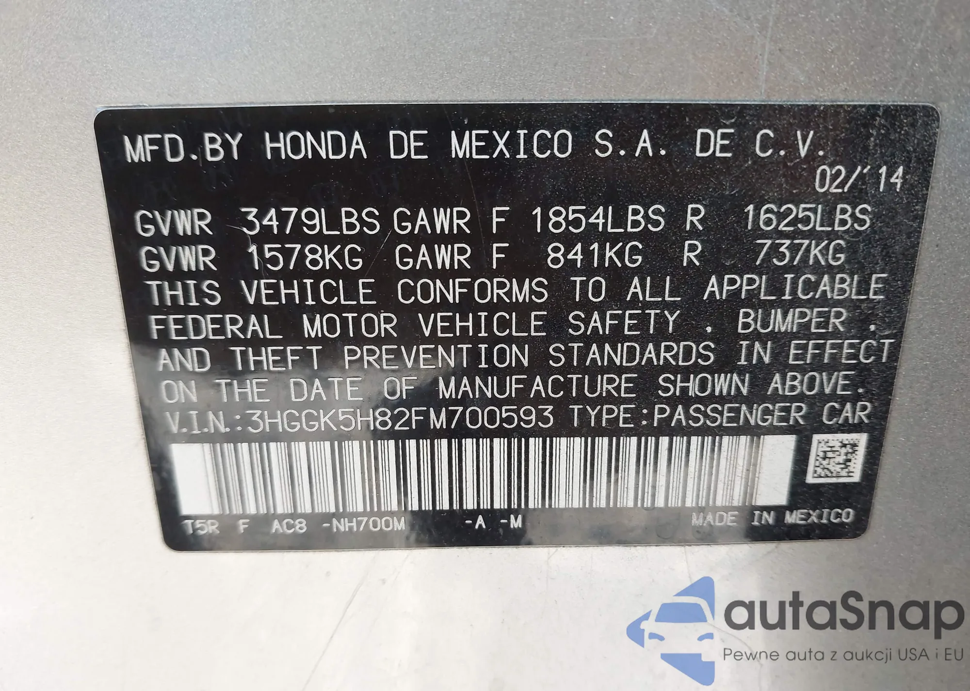 • VIN 3HGGK5H82FM700593