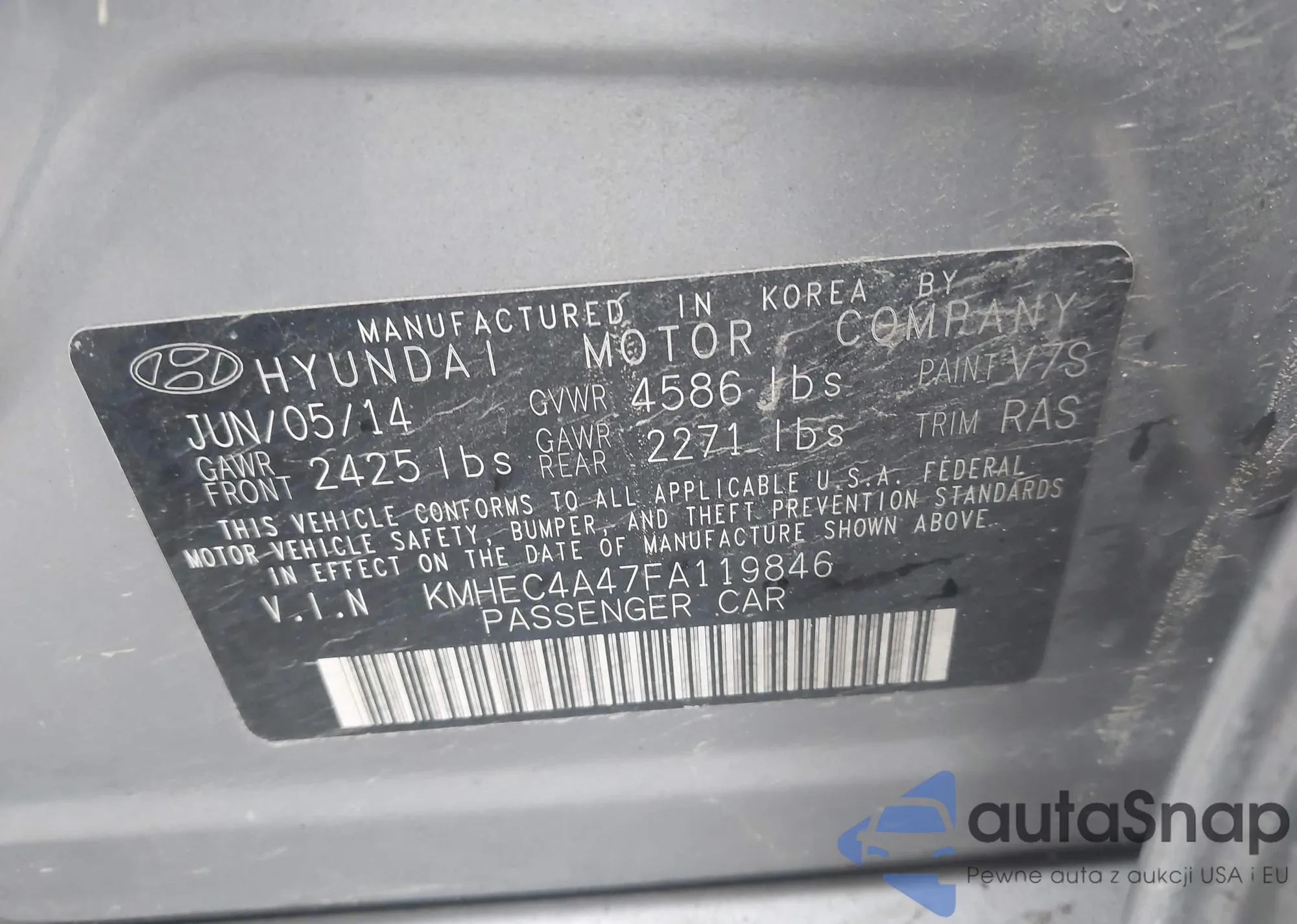 LOT: 43780508 VIN: KMHEC4A47FA119846