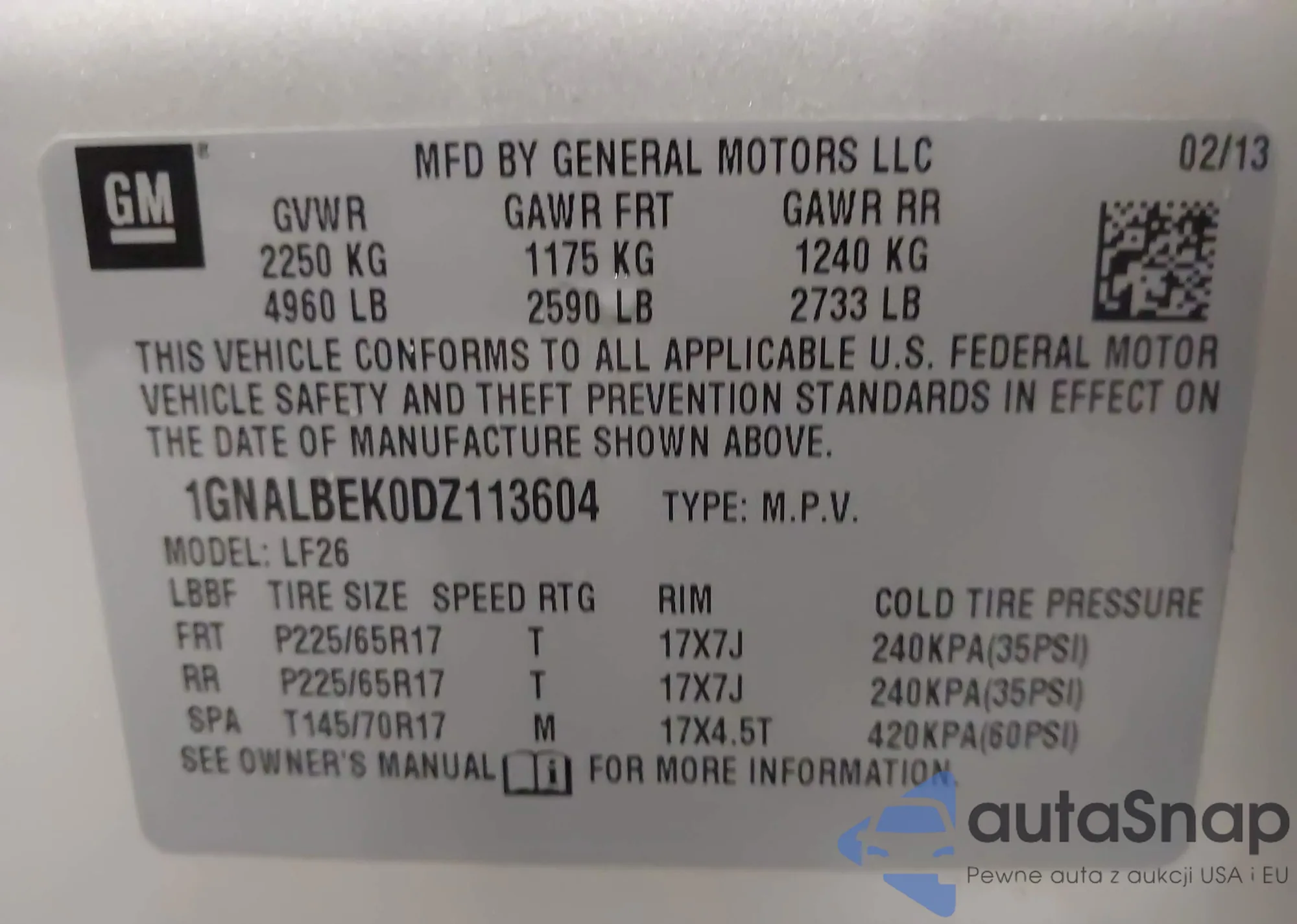 LOT: 43446864 VIN: 1GNALBEK0DZ113604