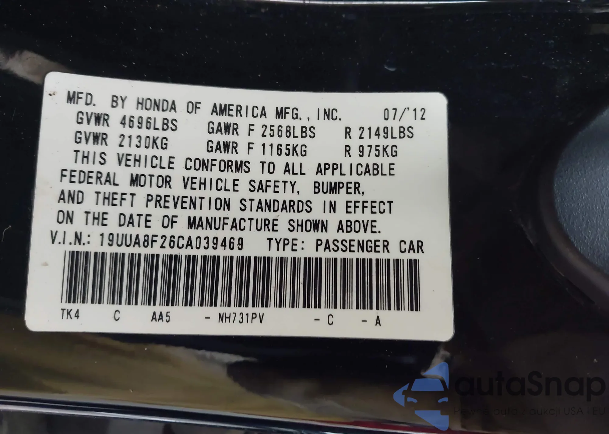 • VIN 19UUA8F26CA039469