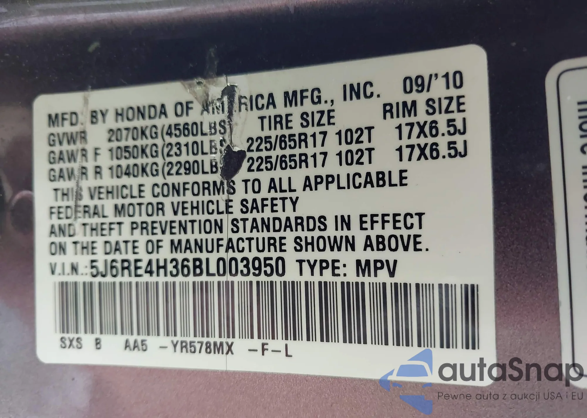• VIN 5J6RE4H36BL003950