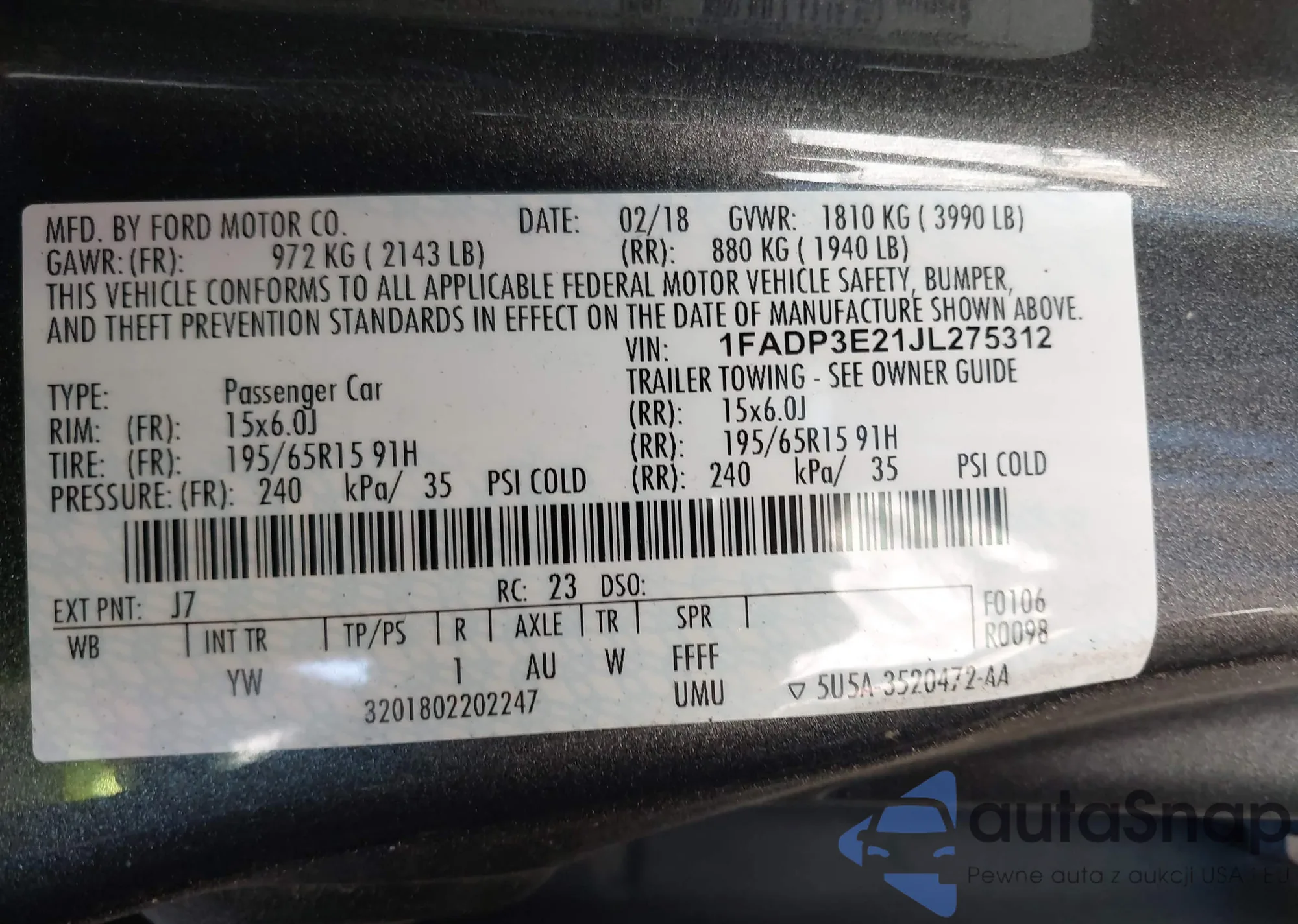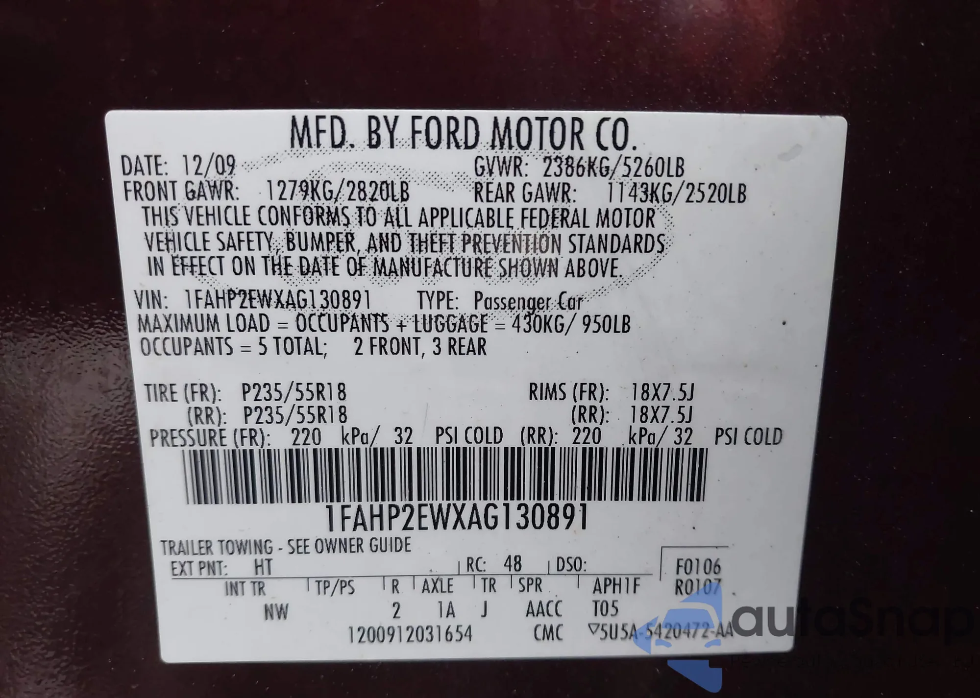 LOT: 43936496 VIN: 1FAHP2EWXAG130891