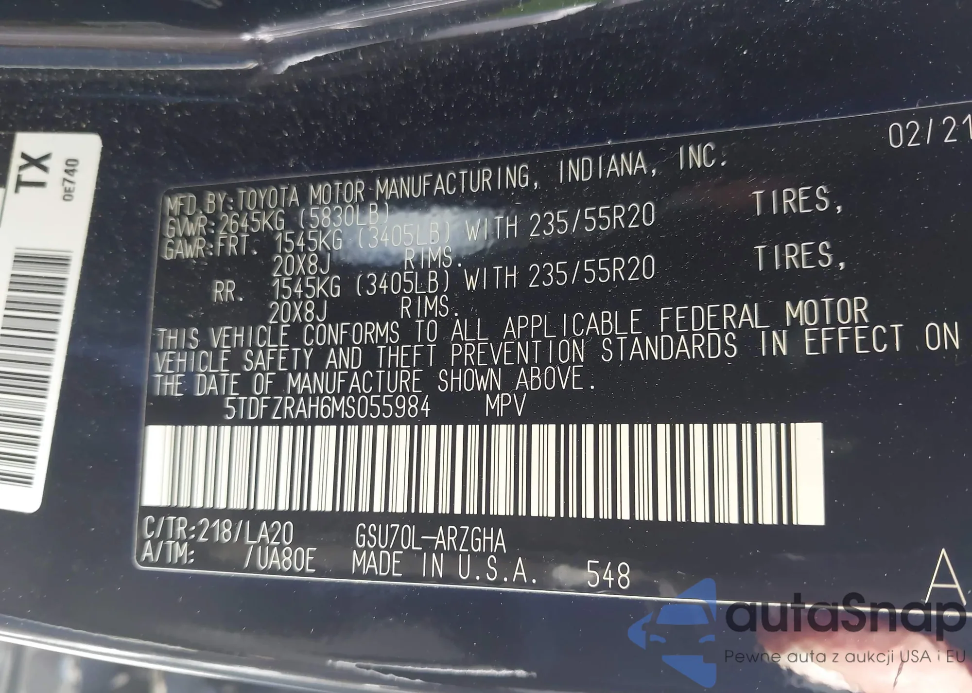 LOT: 43622078 VIN: 5TDFZRAH6MS055984