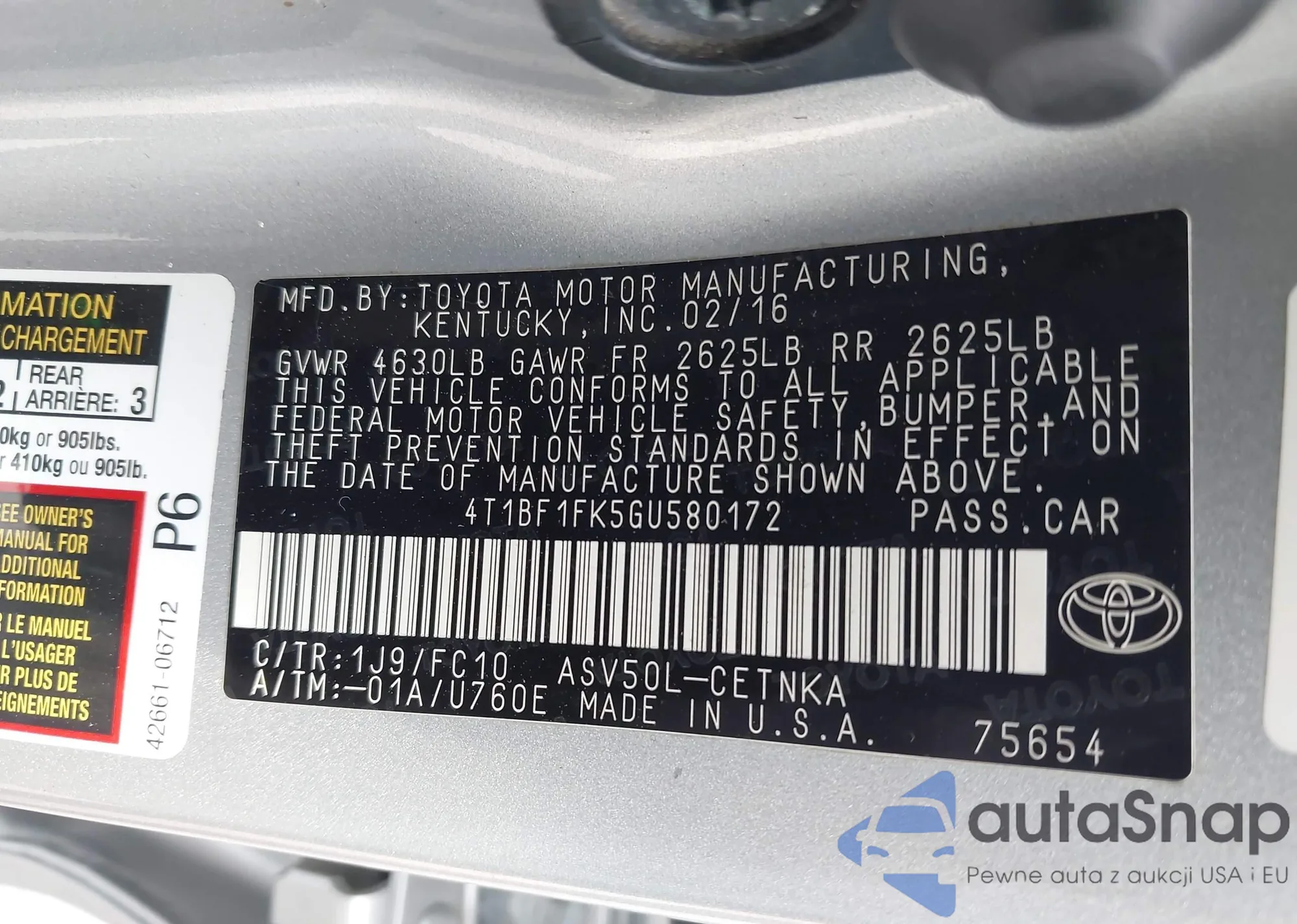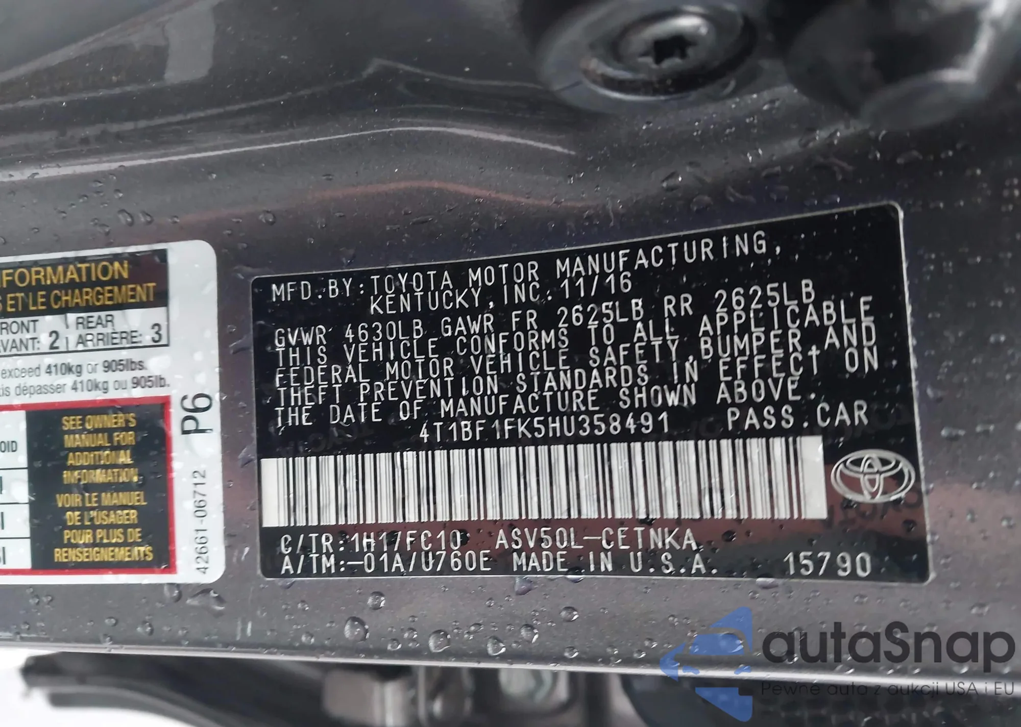 LOT: 43792476 VIN: 4T1BF1FK5HU358491
