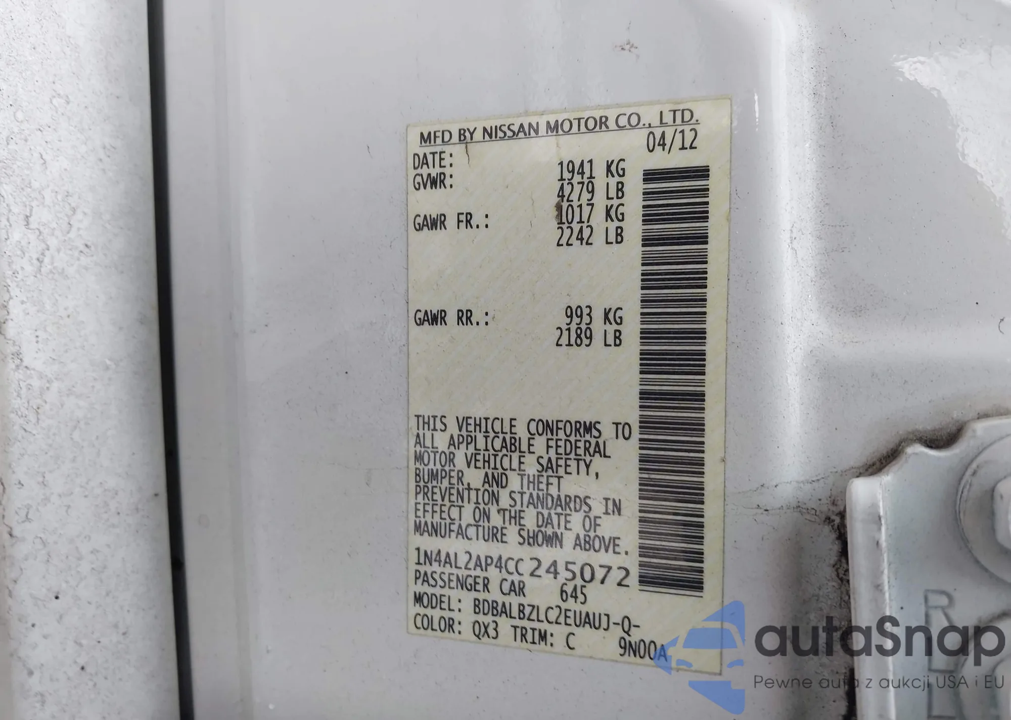 LOT: 43843524 VIN: 1N4AL2AP4CC245072