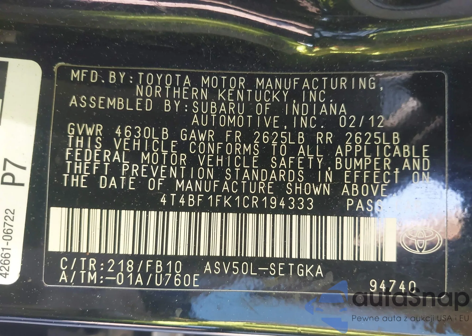 • VIN 4T4BF1FK1CR194333
