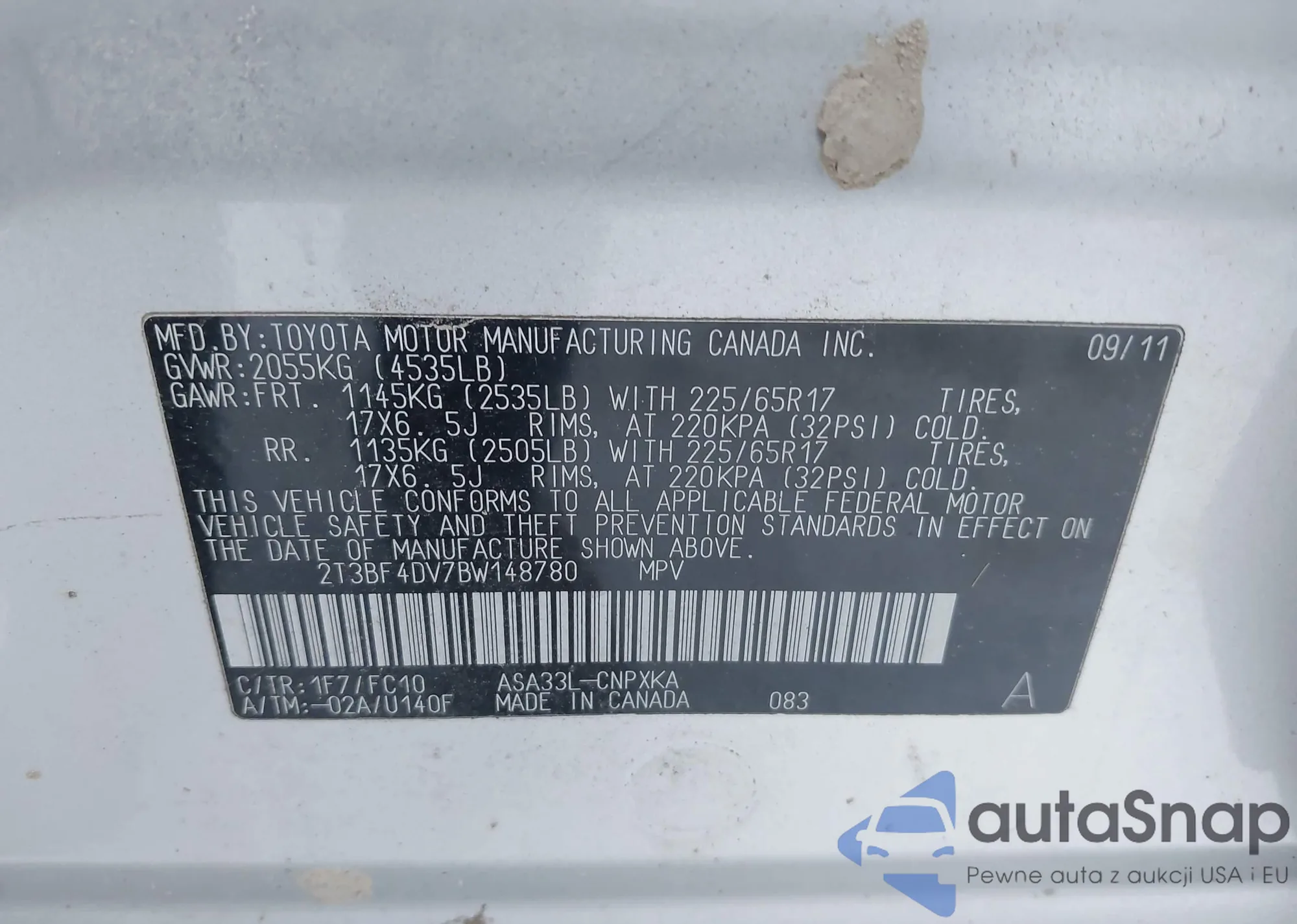 • VIN 2T3BF4DV7BW148780