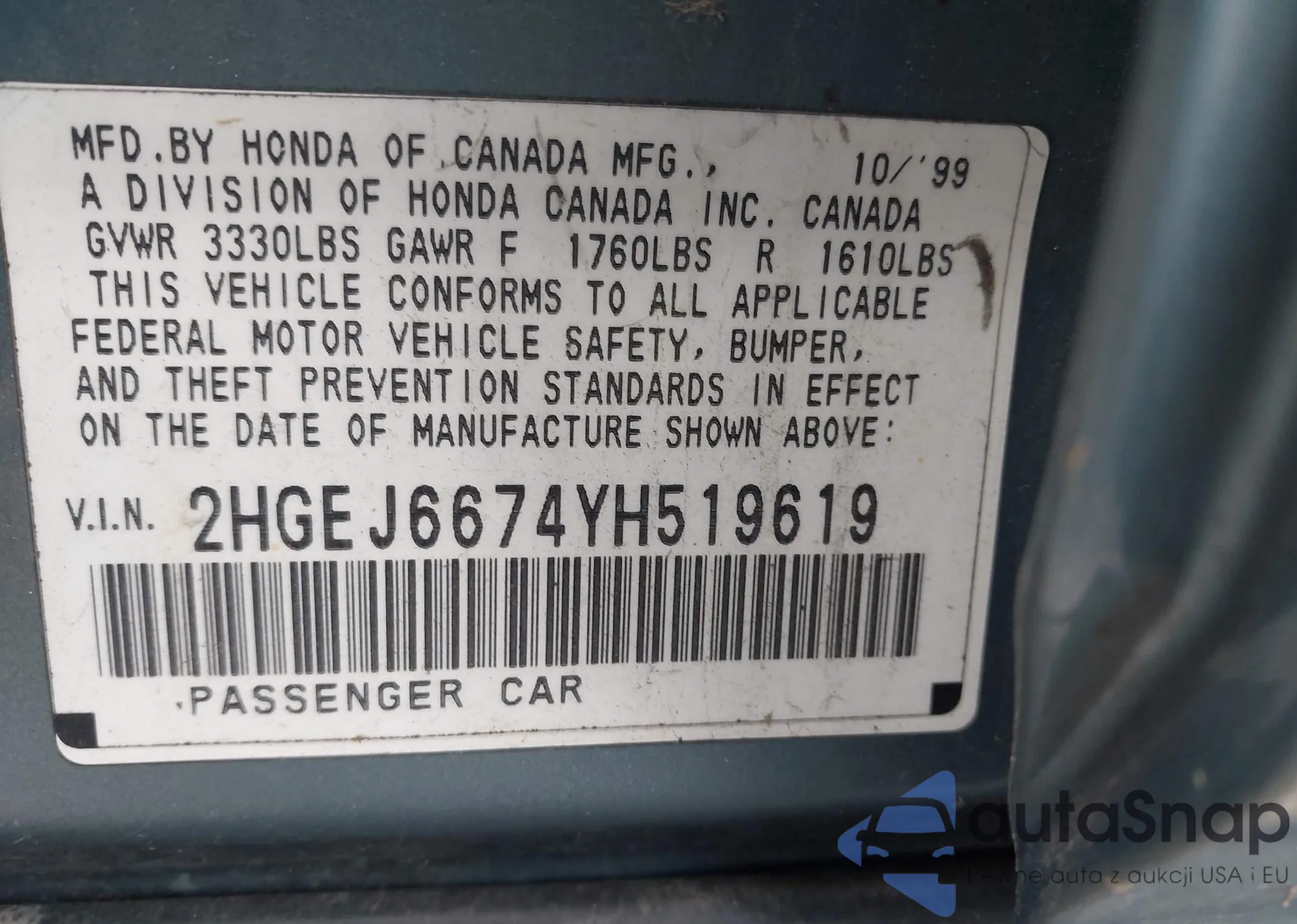 • VIN 2HGEJ6674YH519619