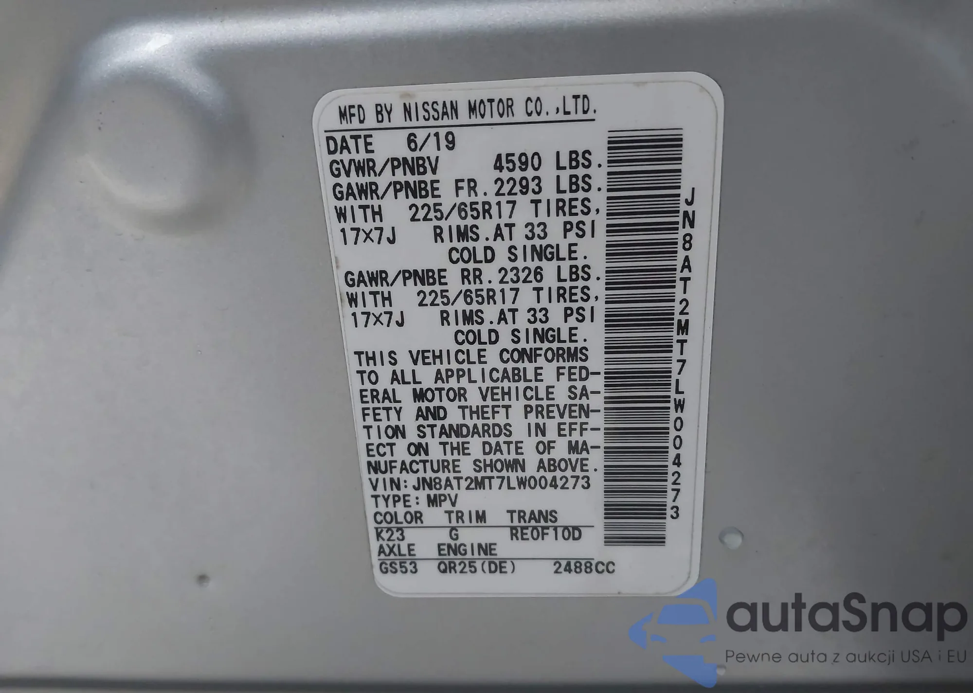 LOT: 43832835 VIN: JN8AT2MT7LW004273