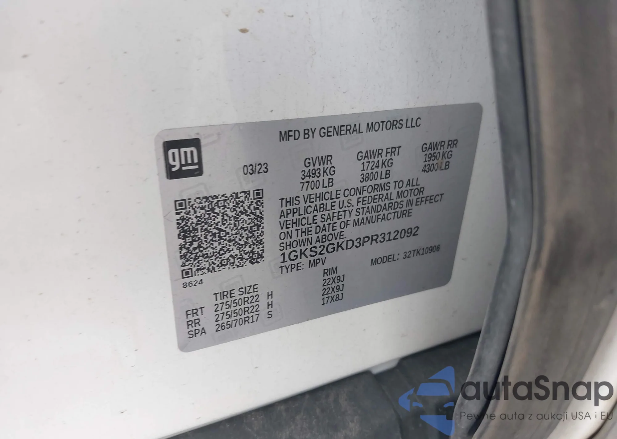 LOT: 43300321 VIN: 1GKS2GKD3PR312092