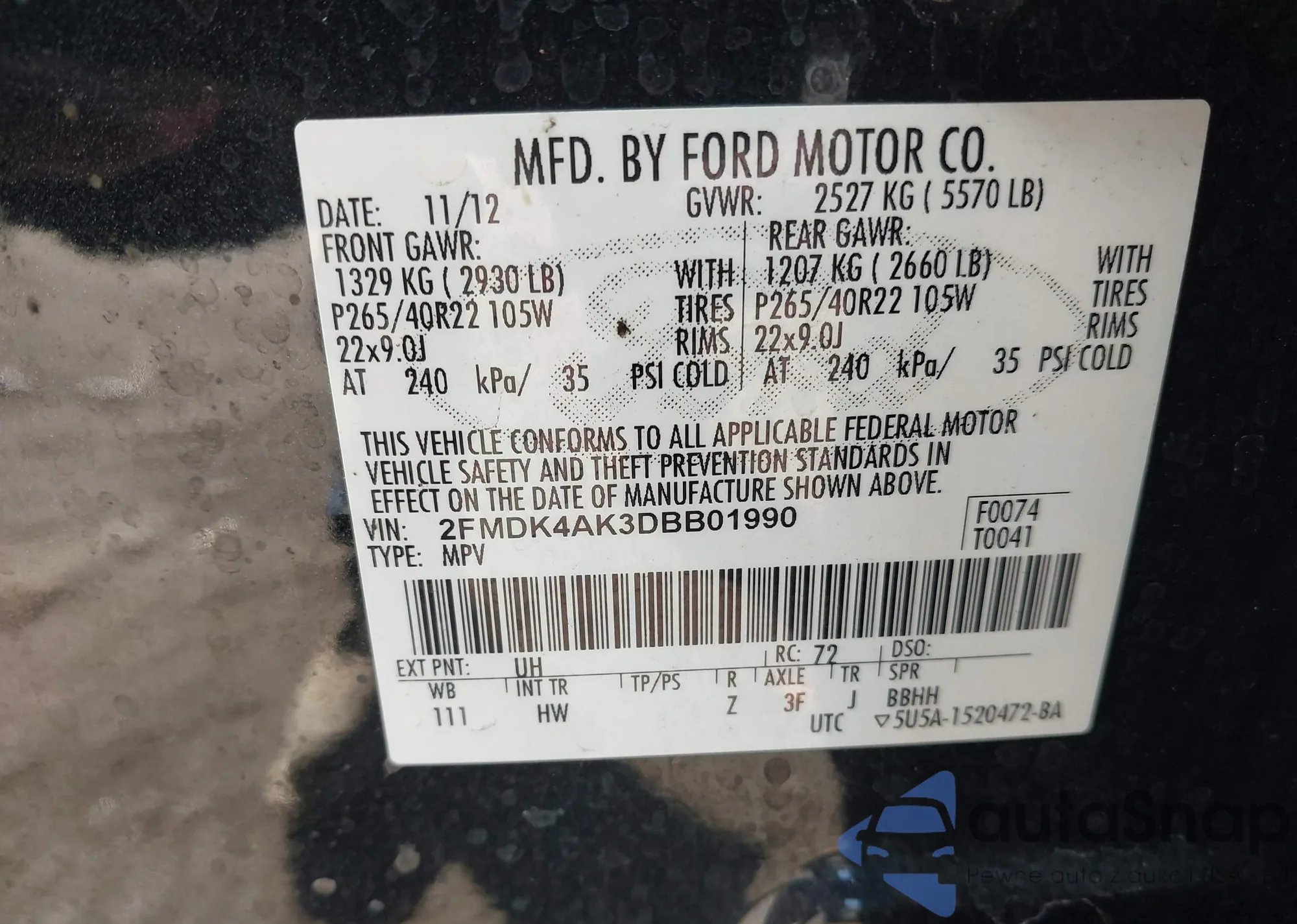 • VIN 1FMCU0HX5DUC09392